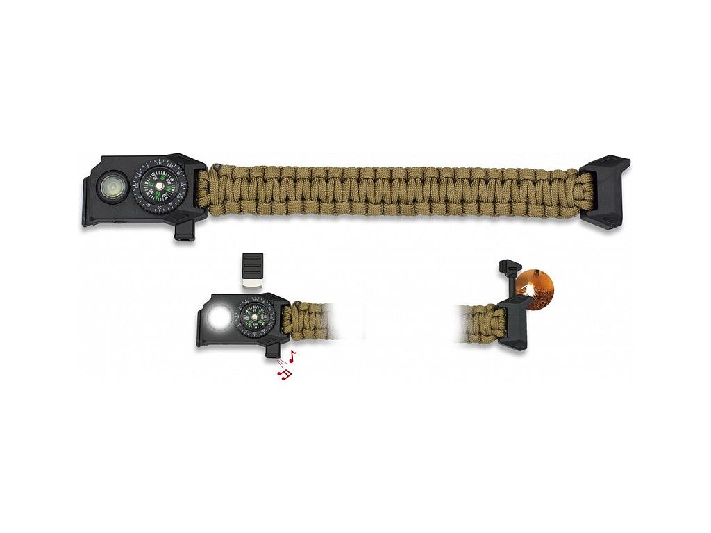 Paracord bracelet with firestarter, compass, whistle, and light in coyote color.
