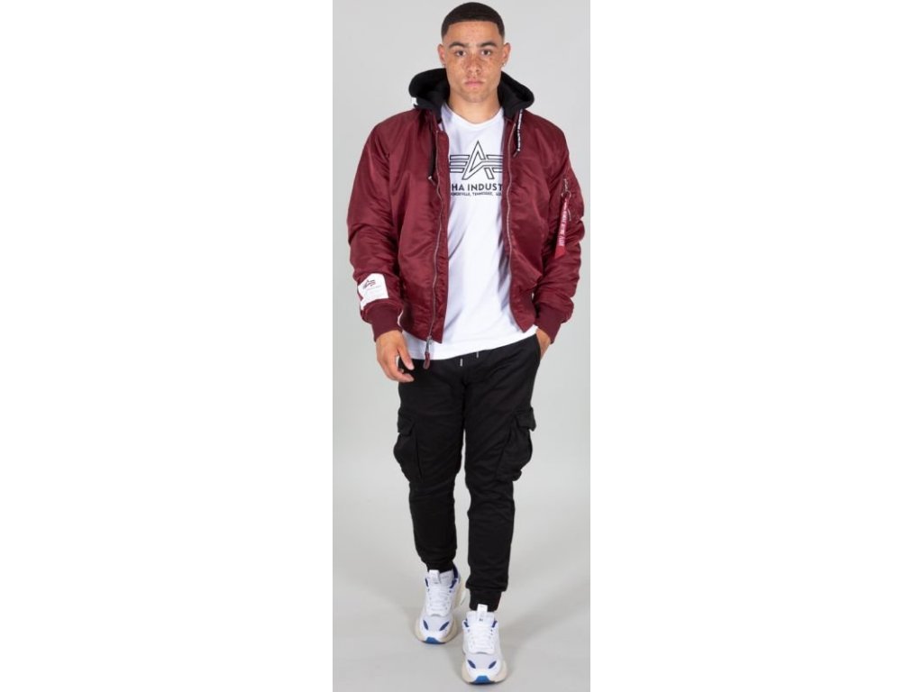 Další výrazné prvky zahrnují potisk loga Alpha Industries na rukávech a kapuci, praktické vnější kapsy s knoflíkovým zapínáním a charakteristickou ramenní kapsu na zip s červenou visačkou „Remove Before Flight“. Kapuce má také šňůrky s potiskem, které dodávají bundě sportovní vzhled.
