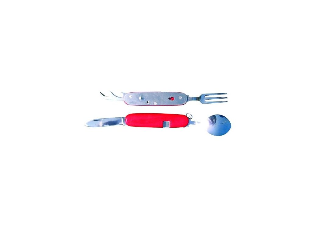 Kompaktní sada příborů obsahující nůž, vidličku, lžíci, otvírák na konzervy a otvírák na lahve. Složená sada má velikost 9 cm