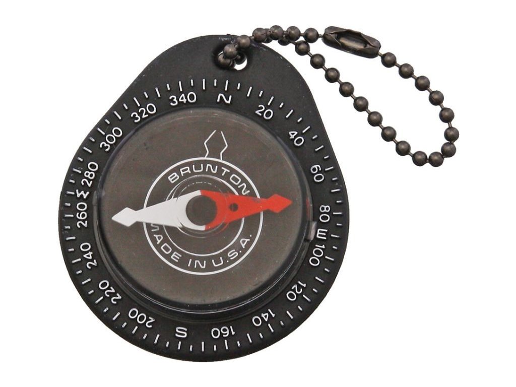 Voděodolný kompas s pětistupňovou stupnicí a mosazným řetízkem pro upevnění na klíče. Vyrobeno v USA.