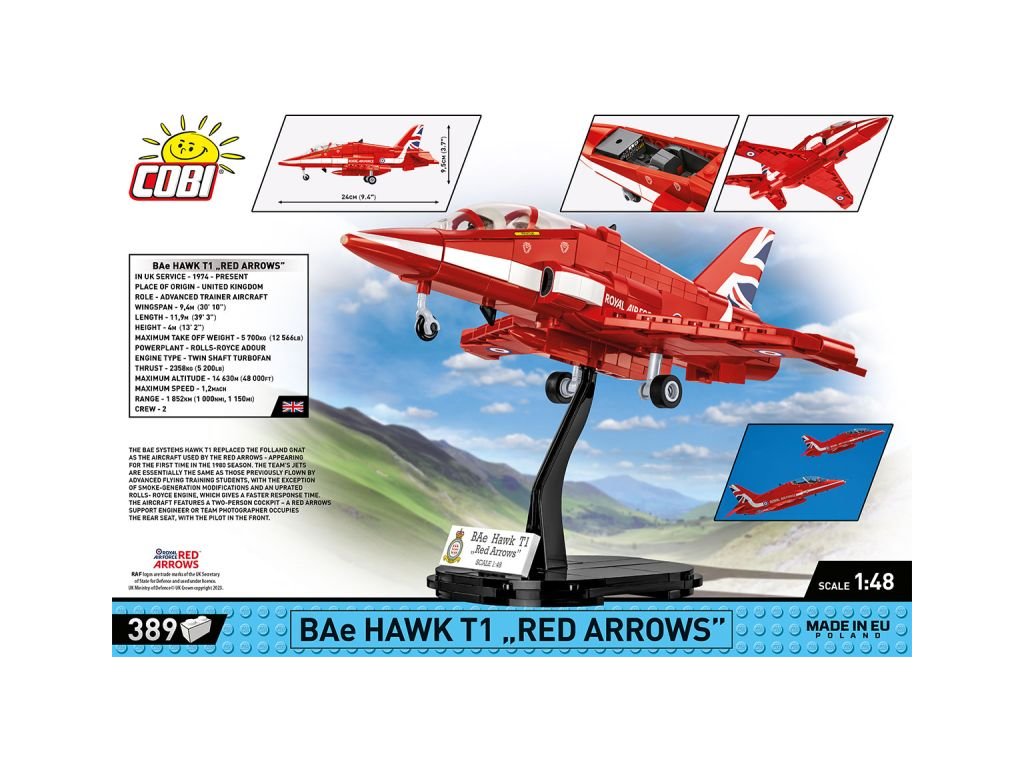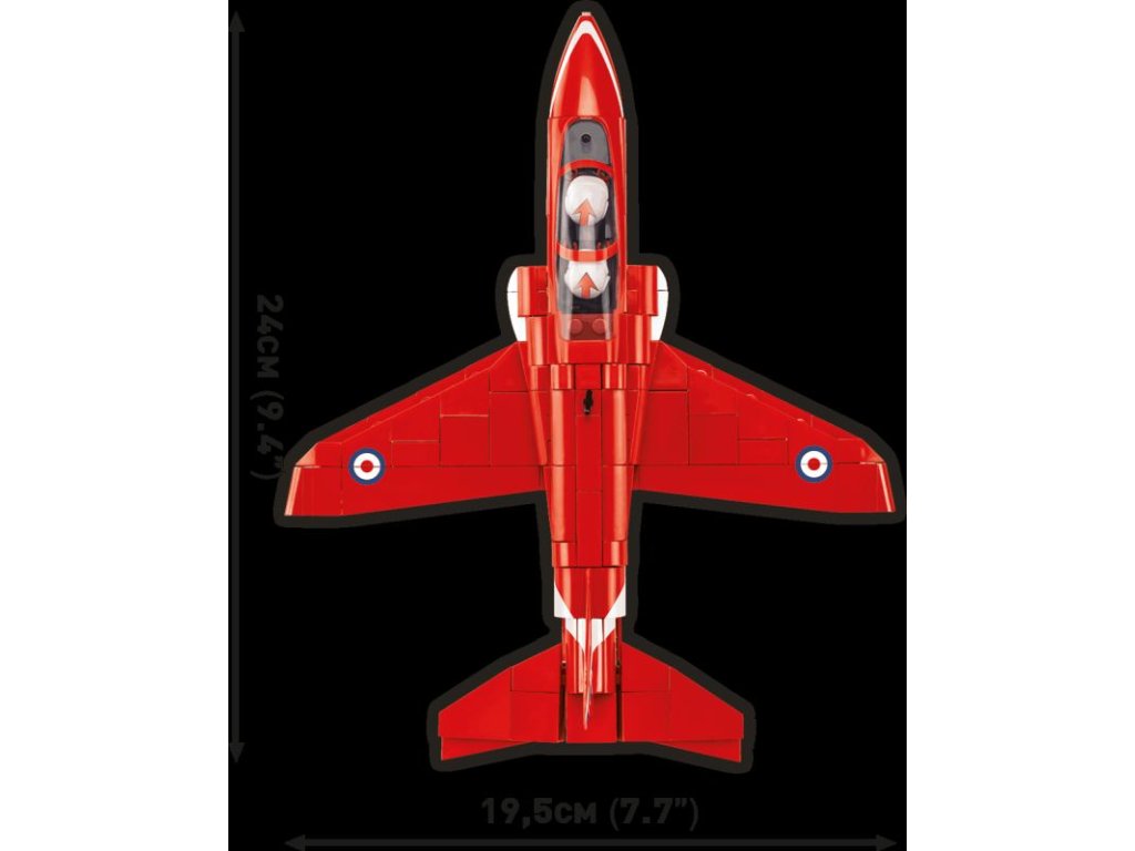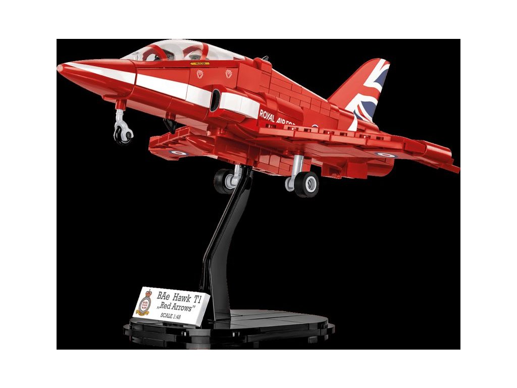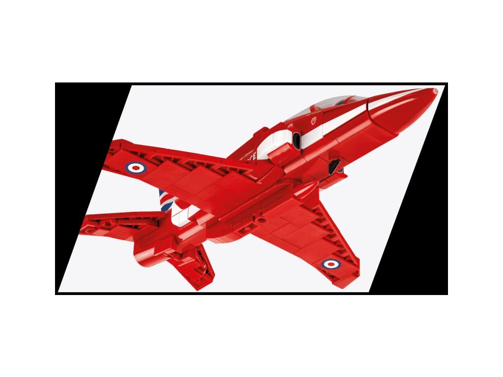Stavebnice pokročilého proudového cvičného letadla BAE Hawk T1 ve barvách akrobatické skupiny RED ARROWS. Sestavený model má odnímatelný kryt kokpitu pro jednoduché usazení speciálně upravených polopostaviček pilotů. Figurky není možné použít jiným způsobem. Model může stát na vlastním odnímatelném podvozku, nebo ho můžete bezpečně uložit do stojanu s přiloženým popisem.