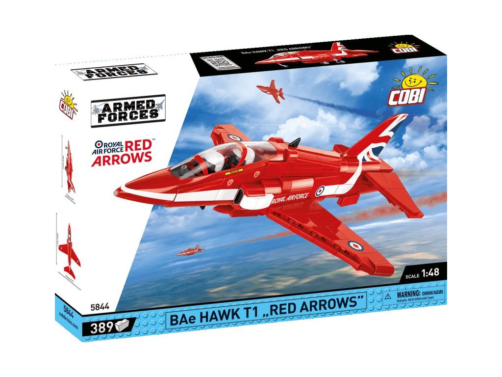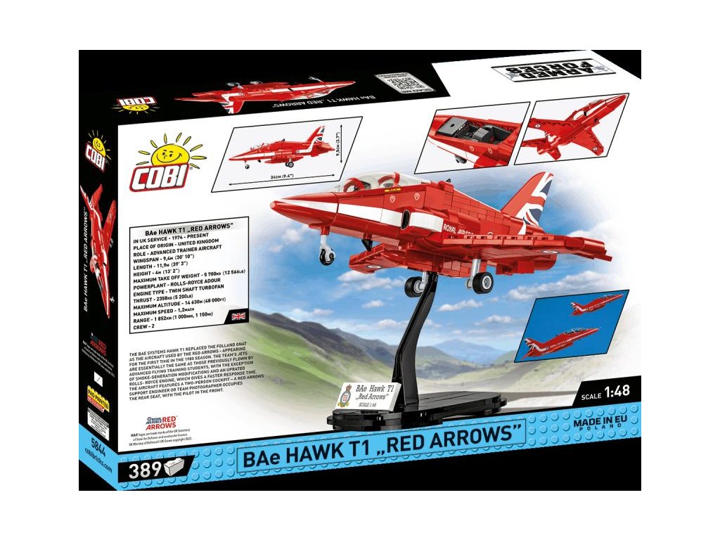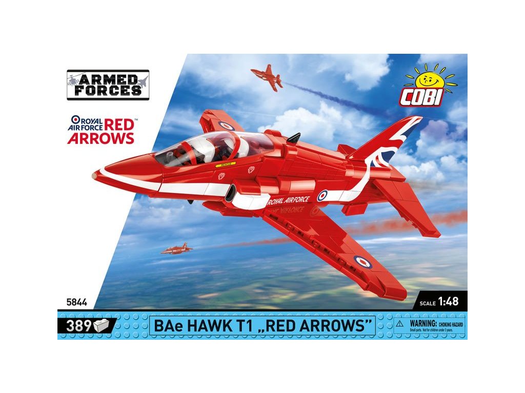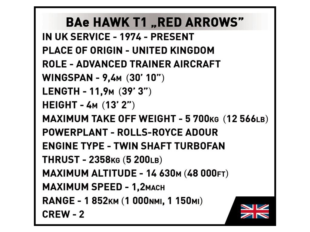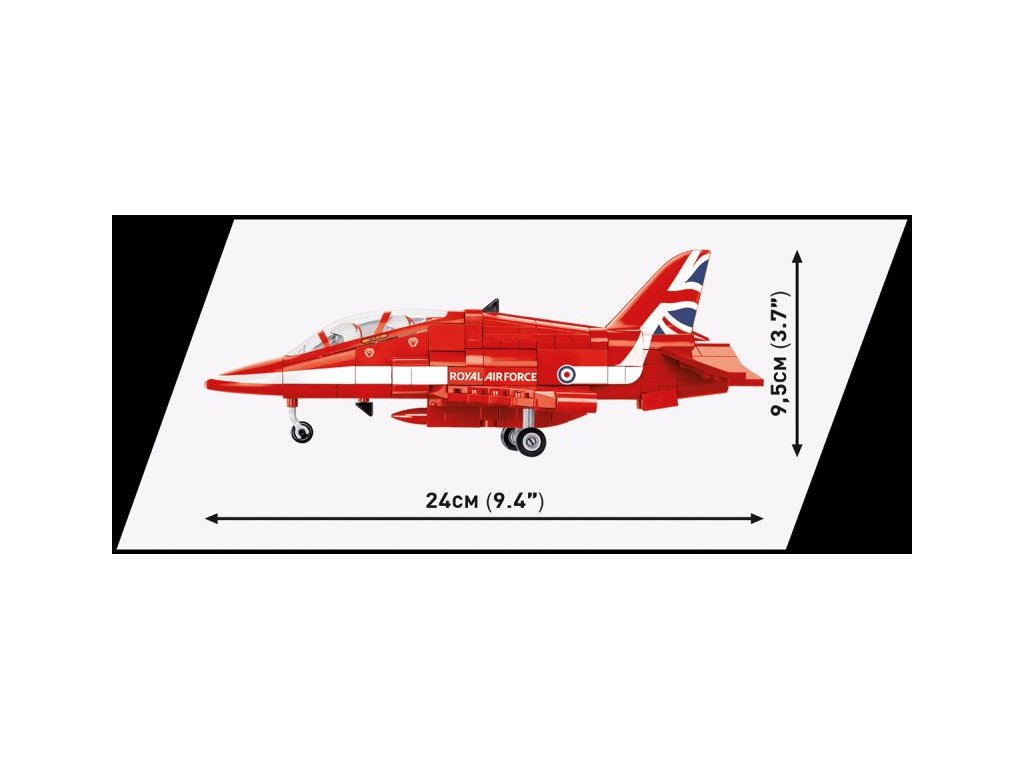 Stavebnice pokročilého proudového cvičného letadla BAE Hawk T1 ve barvách akrobatické skupiny RED ARROWS. Sestavený model má odnímatelný kryt kokpitu pro jednoduché usazení speciálně upravených polopostaviček pilotů. Figurky není možné použít jiným způsobem. Model může stát na vlastním odnímatelném podvozku, nebo ho můžete bezpečně uložit do stojanu s přiloženým popisem.