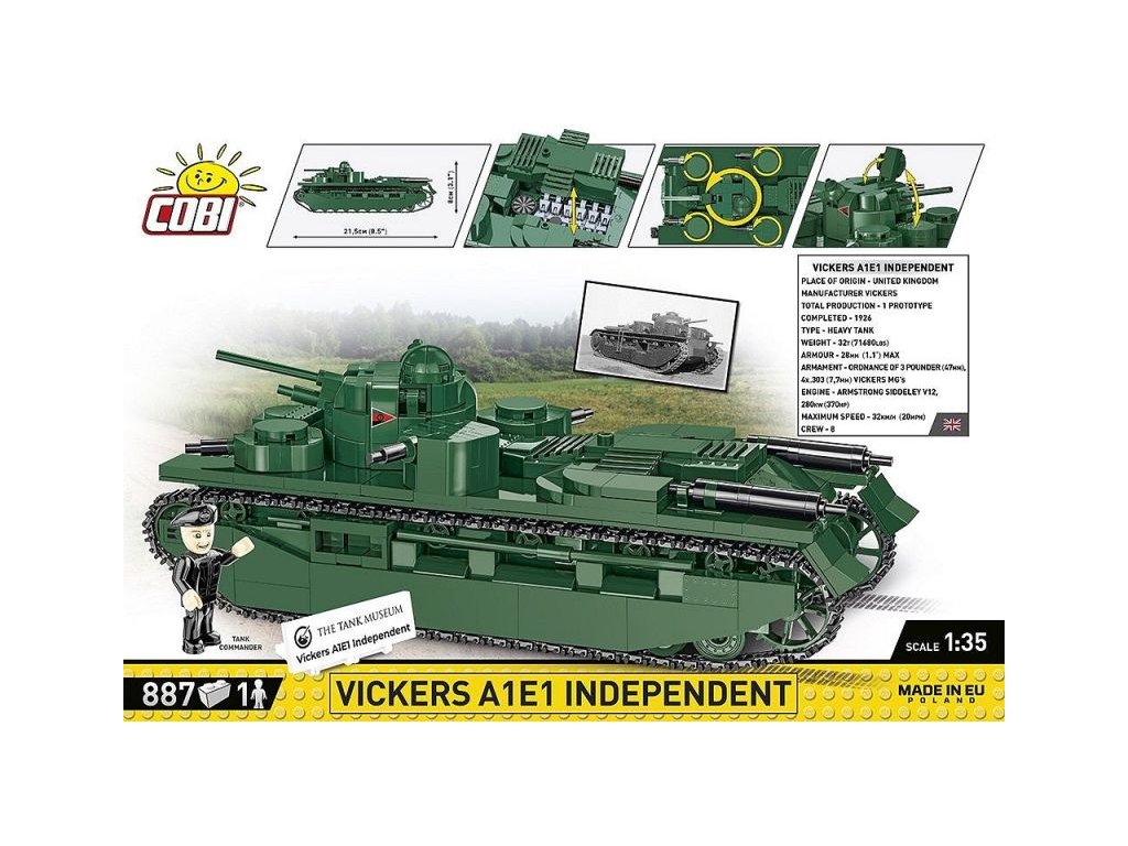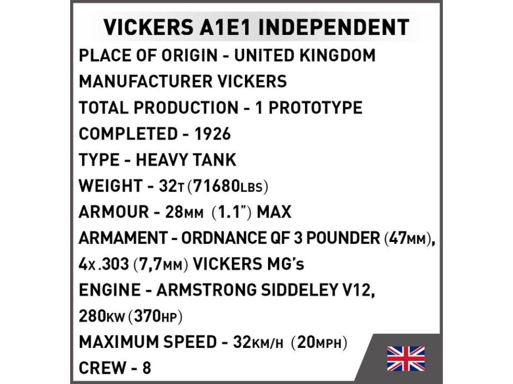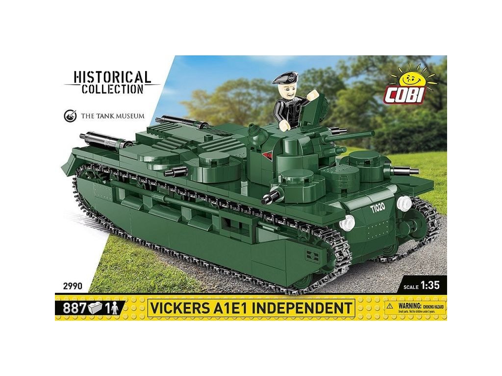 Stavebnice britského tanku Vickers A1E1 v měřítku 1:35 má rozměry 21,5 cm na délku, 8 cm na šířku a 8 cm na výšku. Tank má pohyblivé prvky, jako jsou otočná hlavní věž s pohyblivým kanónem, otočné kulometné věžičky nebo funkční pásový podvozek. Pod výklopnou kapotou je umístěna maketa motoru. Stavebnice vyrobená podle předlohy jediného zachovalého exempláře se skládá z 887 dílků a obsahuje figurku tankisty.