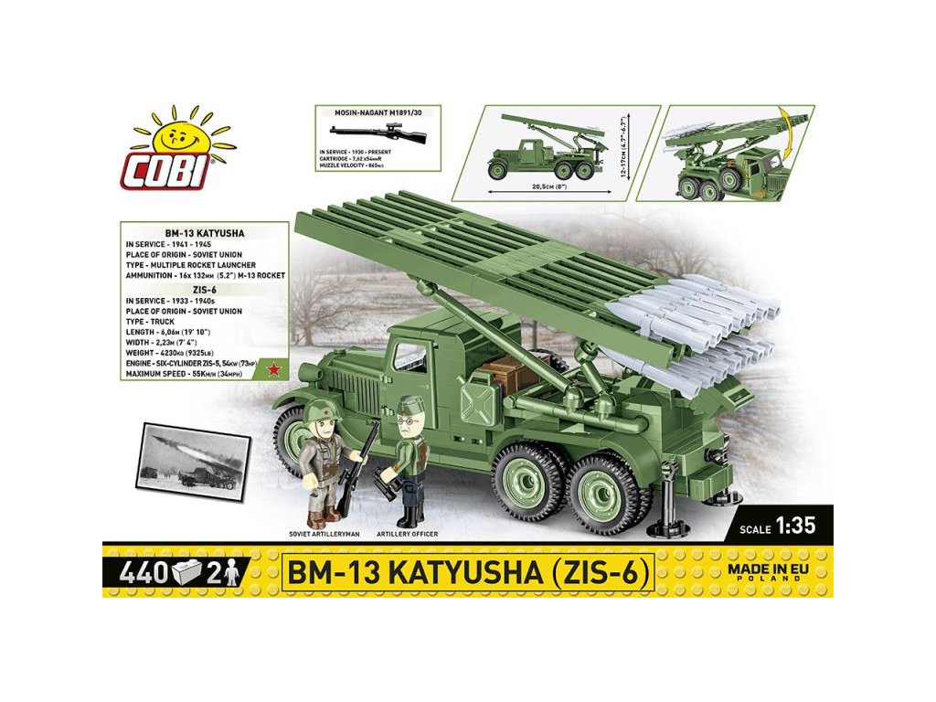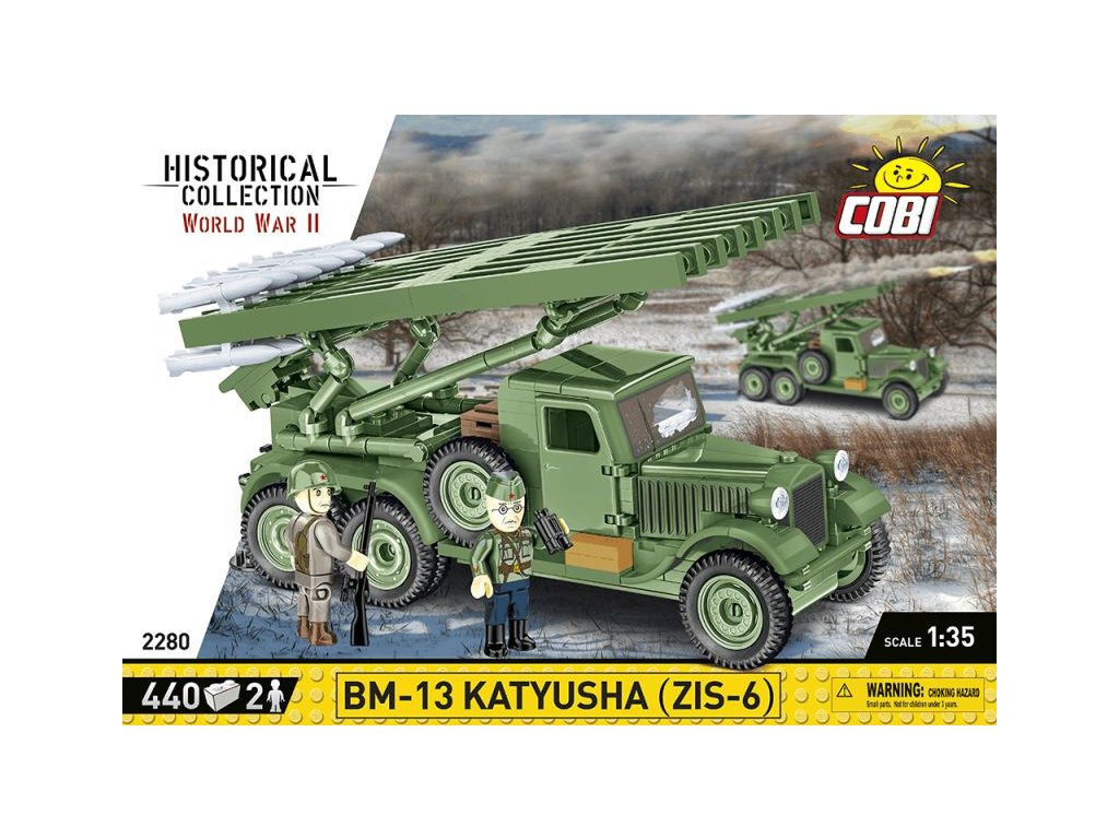 Stavebnice ruského raketometu BM-13 Kaťuša na podvozku nákladního auta ZIS-6. Sestavený model má sklopné stabilizační podpěry, lafetu s nastavitelným zaměřováním a sadu 14 raket M-13. Za kabinou se nachází dřevěná skříňka, kanystr a rezervní kolo. Součástí je také figurka dělostřelce vyzbrojeného puškou Mosin-Nagant a figurka důstojníka.