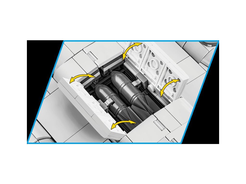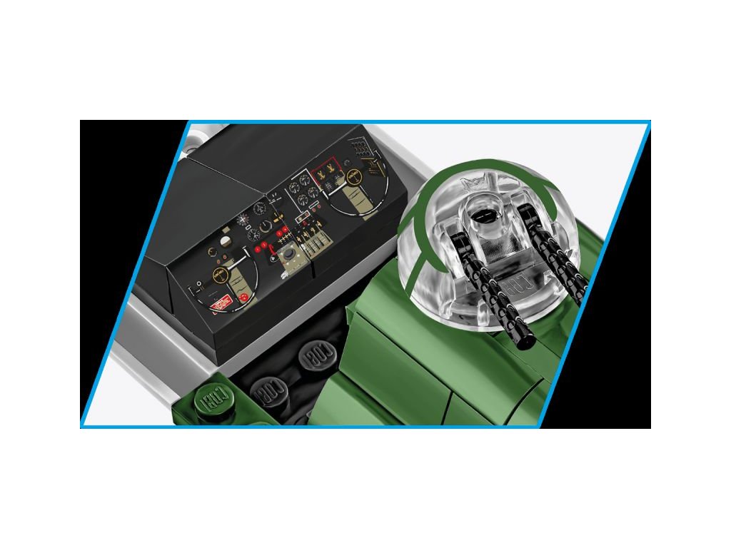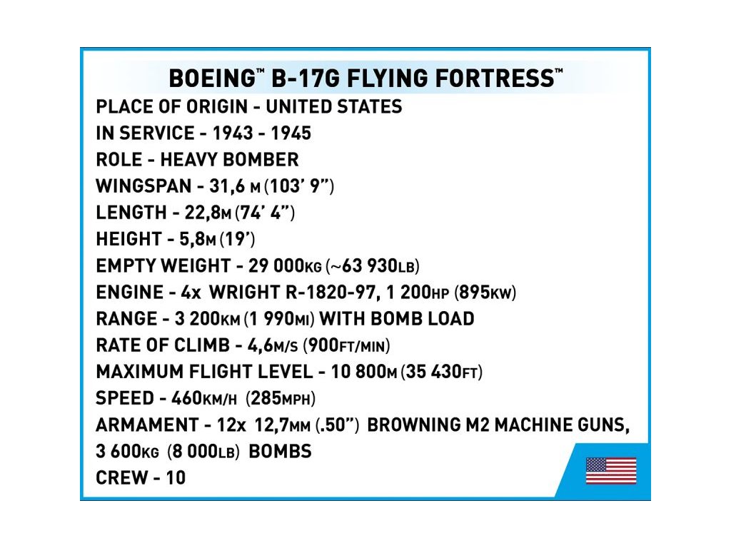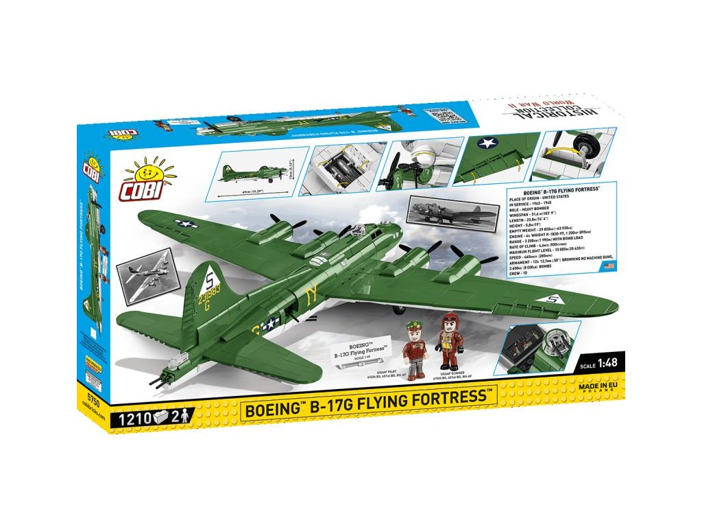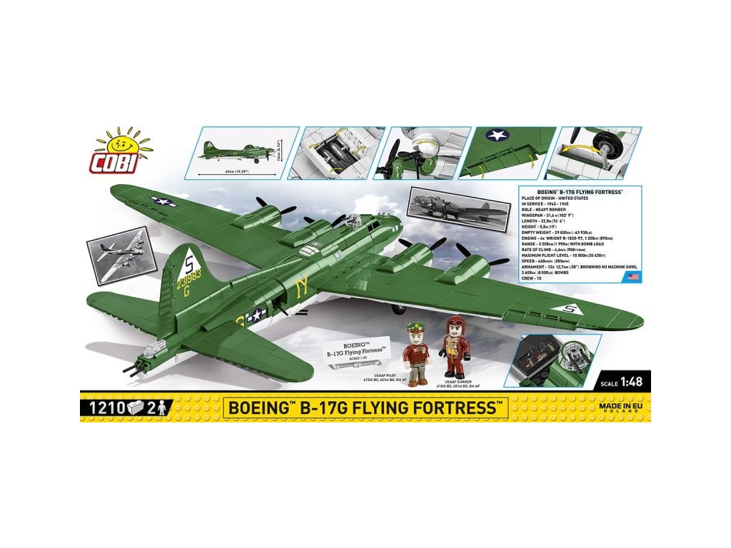 Stavebnice slavného amerického bombardéru Boeing B-17 z 8. armády, 615. bombardovací letky. Sestavený model má nastavitelné řídicí plochy, zatahovací podvozek, otevírací bombovnici, otočné vrtule a otočné protiletadlové věže. Součástí je figurka pilota, figurka střelce, sada bomb a kostky s popisem. Stavebnice je vyrobena na základě oficiální licence společnosti The Boeing Company.