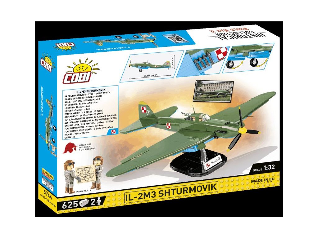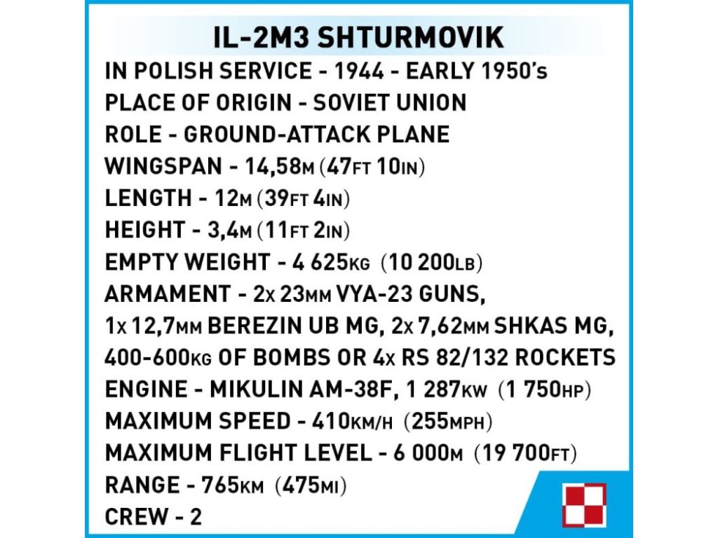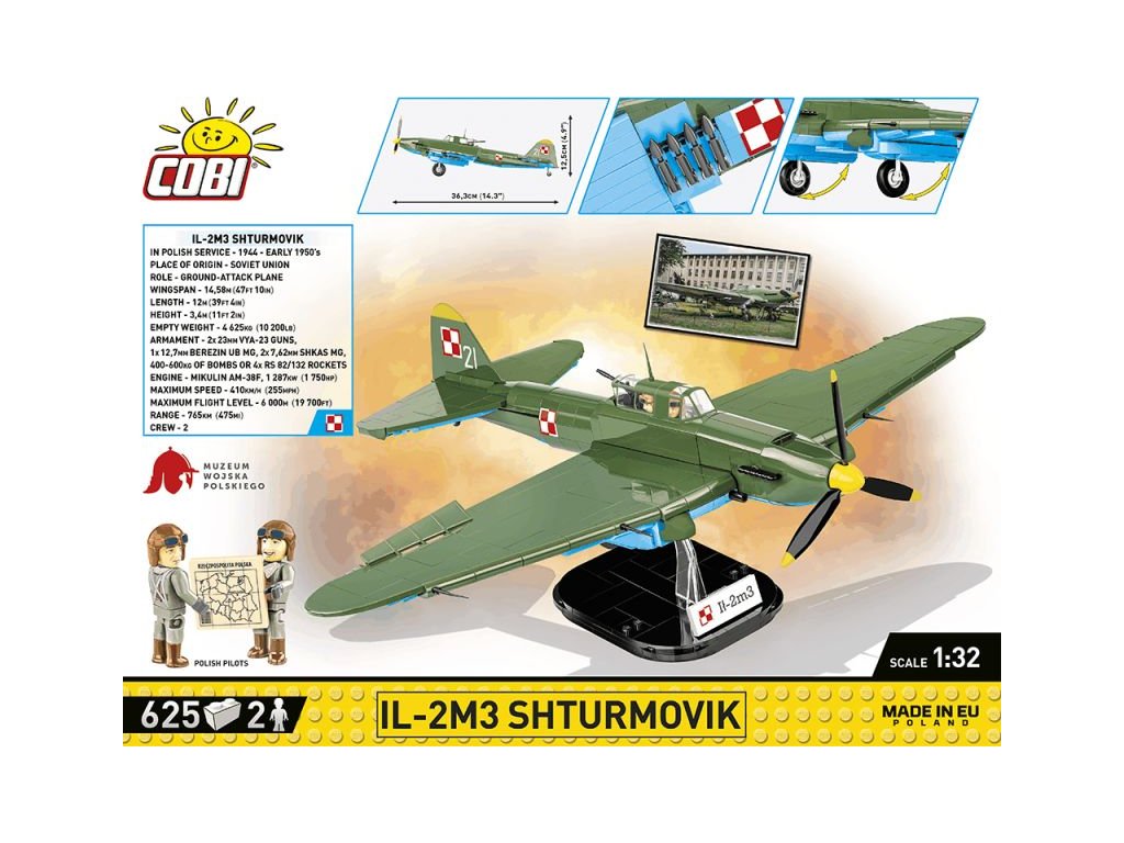 Stavebnice modelu ruského bojového letadla IL-M3 ve barvách polského letectva. Sestavený model má odnímatelný kryt kokpitu pro snadné usazení figurky pilota a střelce. Kola podvozku jsou sklápěcí a pod křídly jsou zavěšeny neřízené rakety. Model může stát na vlastním podvozku, nebo na přiloženém stojanu s popisem. Součástí balení je i figurka polského pilota a zadního střelce s mapou.