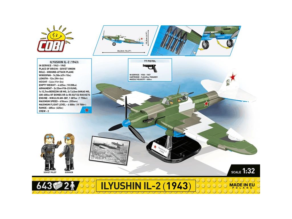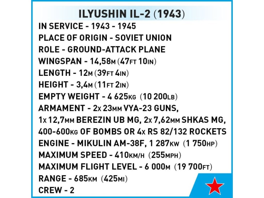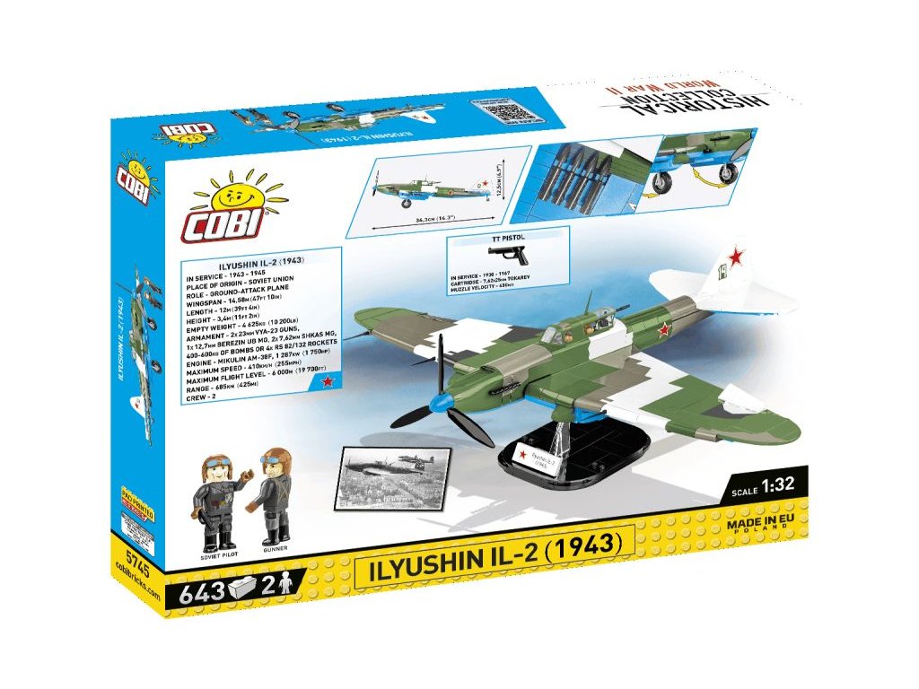 Stavebnice modelu ruského bojového letadla IL-2 verze 1943 v barvách letectva RA. Sestavený model má odnímatelný kryt kokpitu pro snadné usazení figurky pilota a střelce. Kola podvozku jsou sklopná a pod křídly jsou zavěšeny neřízené rakety. Model může stát na vlastním podvozku, nebo na přiloženém stojanu s popisem. Součástí balení je i figurka sovětského pilota ozbrojeného pistolí TT a zadního střelce.