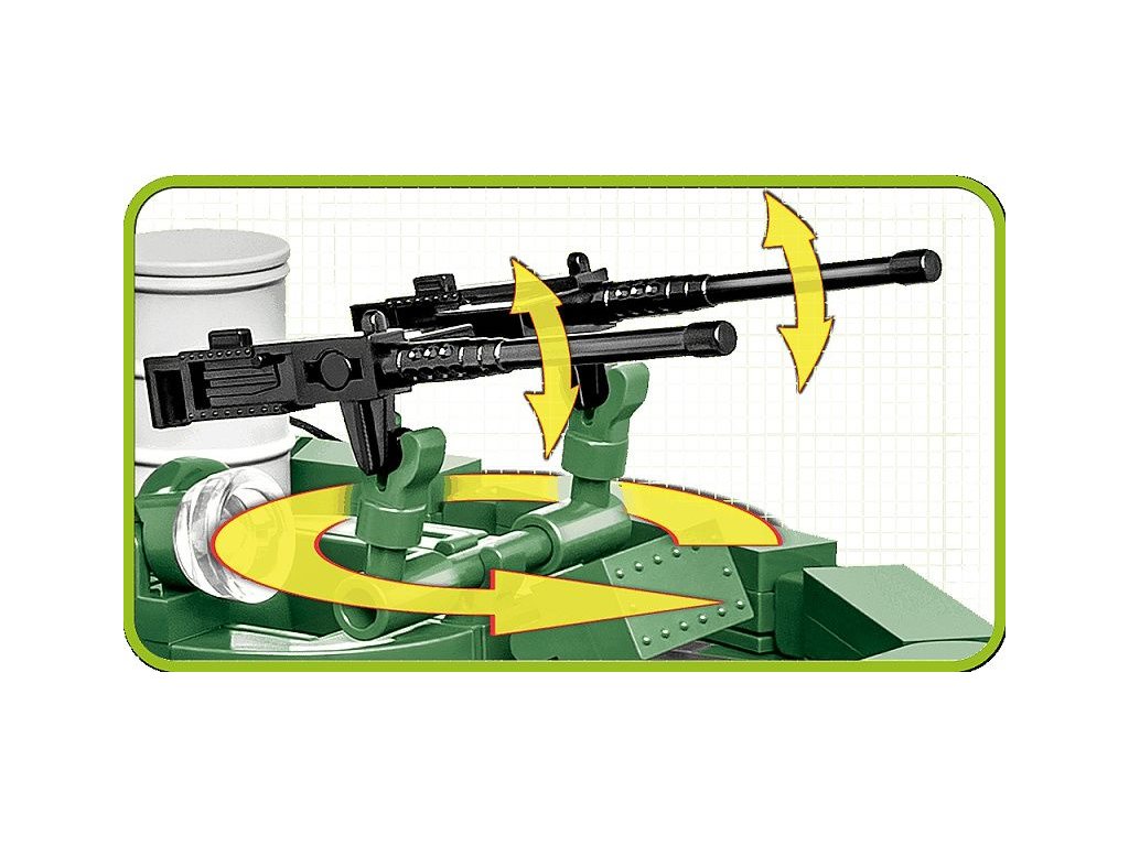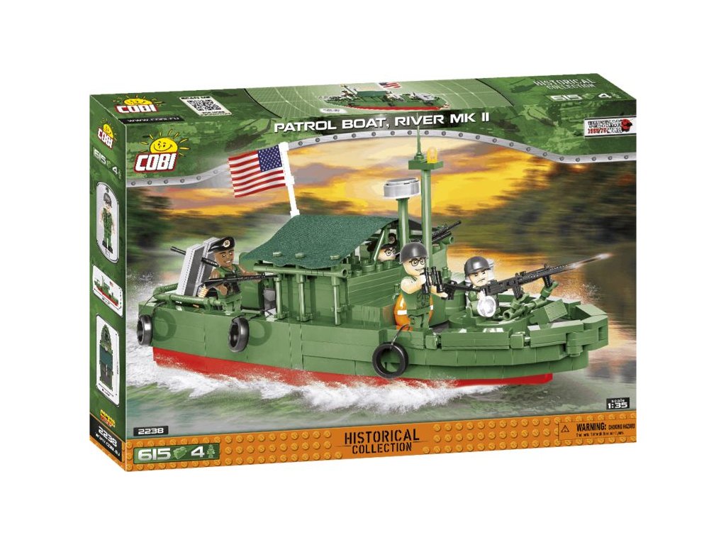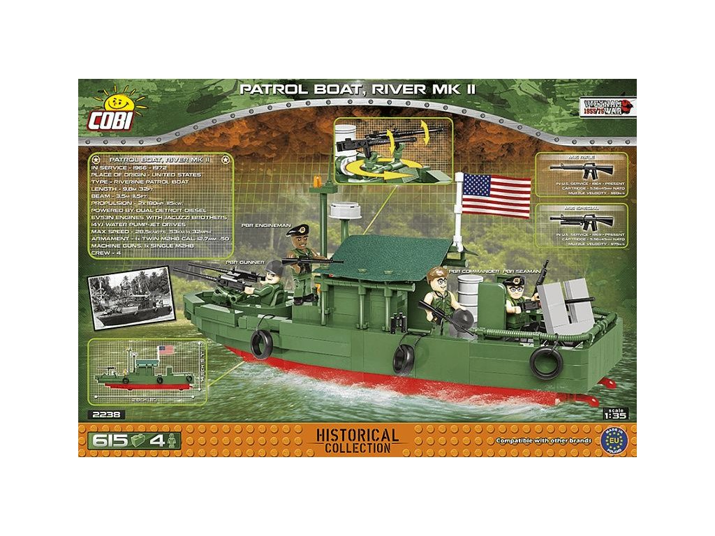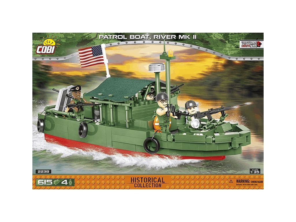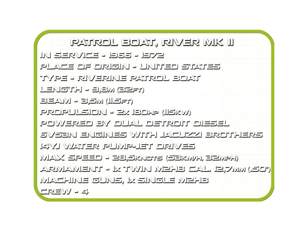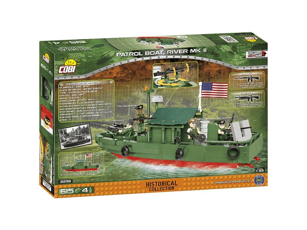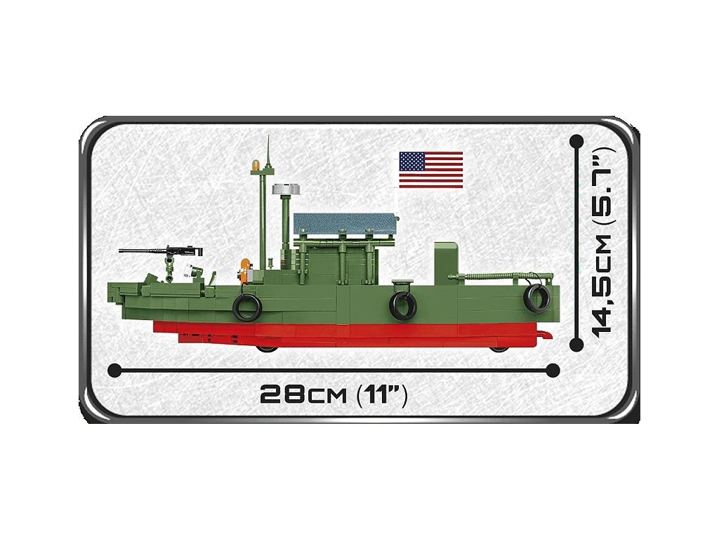 Na palubě se nachází výzbroj v podobě blokových pušek M2HB. Model obsahuje kompletní posádku čtyř vojáků s příslušenstvím a osobními zbraněmi. Fanoušci cihel COBI si kromě látky určitě všimnou i další novinky, kterou je nový vzor vlající vlajky! Po postavení má loďka délku 28 cm. Je skvělým doplňkem sbírky VIETNAM WAR. Cihlový model hlídkového člunu si nevyžaduje lepení ani malování. Všechny grafické prvky a nápisy jsou na cihlách vytištěny ve formě velmi odolných potisků, které se při vystavení slunečnímu záření, vodě nebo dokonce velmi intenzivnímu hraní neopotřebují ani nevyblednou. V modelu nebyly použity žádné nálepky. Sada určitě přinese mnoho radosti nejmladším fanouškům cihel i dospělým nadšencům historie a námořního designu. Model hlídkové lodi bude určitě vypadat velkolepě na sběratelském stole, stejně jako v pokoji každého teenagera a dítěte.