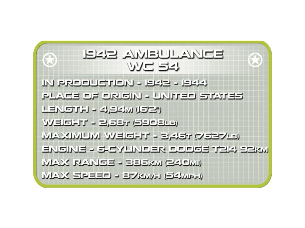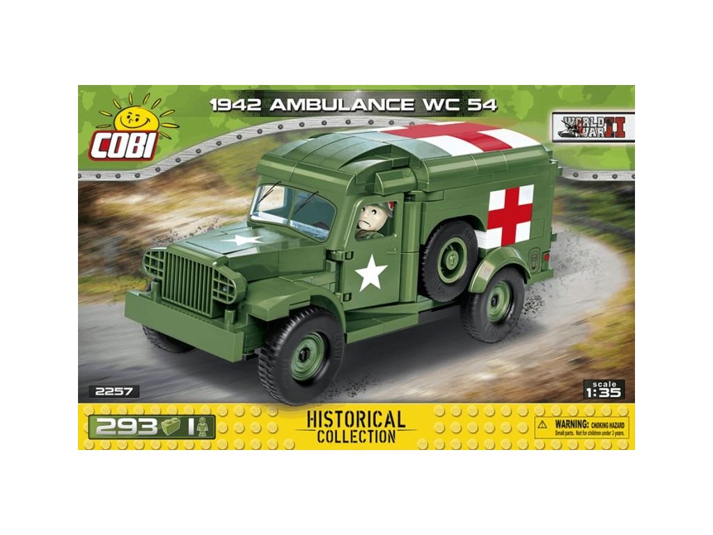 Ze sady 293 stavebních kostek COBI postavíte klasickou americkou vojenskou sanitku WC 54 v měřítku 1:35. Jde nepochybně o jednu z nejúspěšnějších souprav, které COBI vydala v roce 2021. Všechny grafické detaily jsou složené z cihel a vysokokvalitních potisků, které se neopotřebují ani při intenzivním používání. Design vozidla jedinečným způsobem odráží původní tvary jeho historické předlohy. Model je pokračováním série historických vozidel, které byly vytvořeny pomocí speciálně navržených prvků.