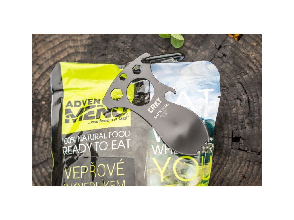 Příbor od amerického výrobce C.R.K.T. vyrobený z jednoho kusu nerezové oceli. Obsahuje: lžičku, vidličku, otvírák na lahve, šroubovák a karabinku.