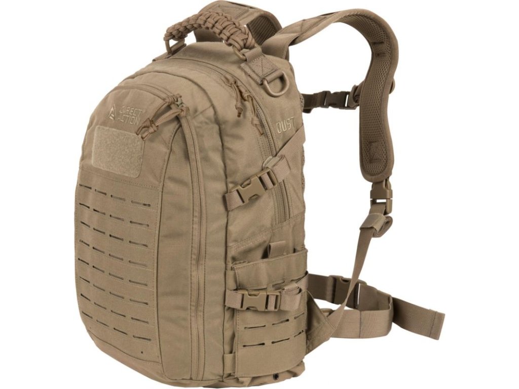 Dust je nejmenší z řady batohů Direct Action a s objemem 20 litrů a je vhodný zejména jako EDC (Every Day Carry) nebo pro základní taktické činnosti. Batoh je koncipován jako dvoukomorový. První, hlavní a největší kapsa má polstrovanou přihrádku pro hydratační vak v zádové části batohu a může být využita i pro uložení radiostanice nebo notebooku o velikosti 15 a navíc má ještě malou síťovanou kapsičku. Druhá menší kapsa obsahuje praktický organizér například na psací potřeby, dole je síťovaná kapsa uzavíraná suchým zipem a naproti je průhledná kapsa uzavíraná zipem. Kapsy na bocích batohu jsou vhodné pro nošení malých předmětů - zde nastala malá změna oproti předchozí generaci - zip byl odstraněn a nahrazen elastickým pásem, který daný prostor rozšířil a umožňuje tak uskladnit i rozměrnější věci jako např. standardní US polní láhev.