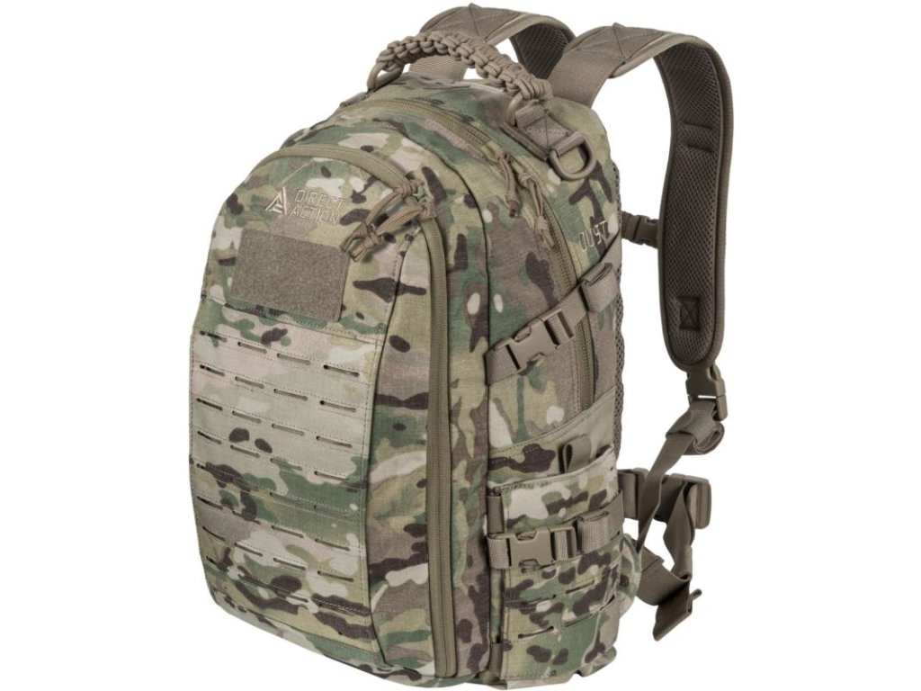 Dust je nejmenší z řady batohů Direct Action a s objemem 20 litrů je vhodný zejména jako EDC (Every Day Carry) nebo pro základní taktické činnosti. Batoh je koncipován jako dvoukomorový. První, hlavní a největší kapsa má polstrovanou přihrádku pro hydratační vak v zádové části batohu a může být využita i pro uložení radiostanice nebo notebooku o velikosti 15 a navíc má ještě malou síťovanou kapsičku. Druhá menší kapsa obsahuje praktický organizér například na psací potřeby, dole je síťovaná kapsa uzavíraná suchým zipem a naproti je průhledná kapsa uzavíraná zipem. Kapsy na bocích batohu jsou vhodné na nošení malých předmětů - zde nastala malá změna oproti předchozí generaci - zip byl odstraněn a nahrazen elastickým pásem, který daný prostor rozšířil a umožňuje tak uskladnit i rozměrnější věci jako např. standardní US polní láhev.