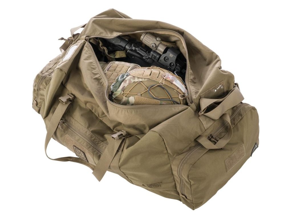 Pohodlný, široký transportní ramenní popruh s nastavitelnou délkou umožňuje nošení tašky na rameni a usnadňuje nasazení. Taška je vybavena transportními držadly a dvěma kompresními popruhy zpevňujícími dno. Velcro panely (suchý zip) na předních a bočních kapsách umožňují připevnit jakoukoliv nášivku nebo znak, např. Moral Patches a dvě fóliovaná okénka vám umožňují umístit identifikační nebo adresní odznak.