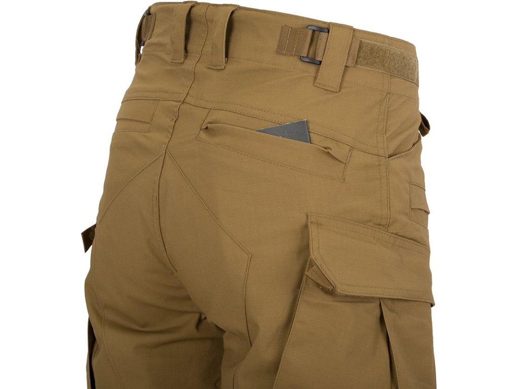 Poslední dvojici kapes pak najdete v zadní části, jsou také ploché a pojmou dokumenty do maximální velikosti A5. Poutka na opasek jsou určena pro opasky do šířky 45 mm. Kalhoty se zapínají pomocí čtyř knoflíků s logem HELIKON-TEX a jejich velikost v pase se dá regulovat pomocí bočních suchých zipů. V oblasti sedu a kolen jsou kalhoty zesílené, přičemž na kolenou najdete kapsy na vložení chráničů.