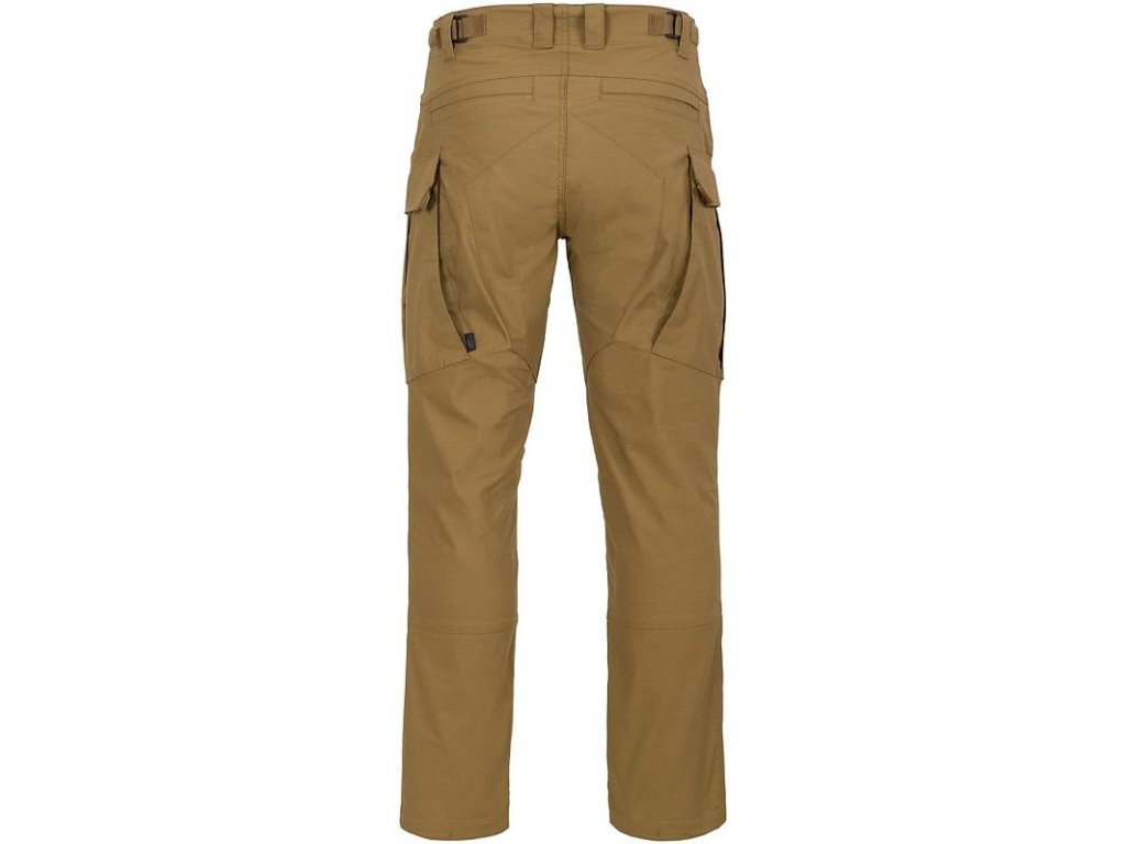 Poslední dvojici kapes pak najdete v zadní části, jsou také ploché a pojmou dokumenty do maximální velikosti A5. Poutka na opasek jsou určena pro opasky do šířky 45 mm. Kalhoty se zapínají pomocí čtyř knoflíků s logem HELIKON-TEX a jejich velikost v pase se dá regulovat pomocí bočních suchých zipů. V oblasti sedu a kolen jsou kalhoty zesílené, přičemž na kolenou najdete kapsy na vložení chráničů.