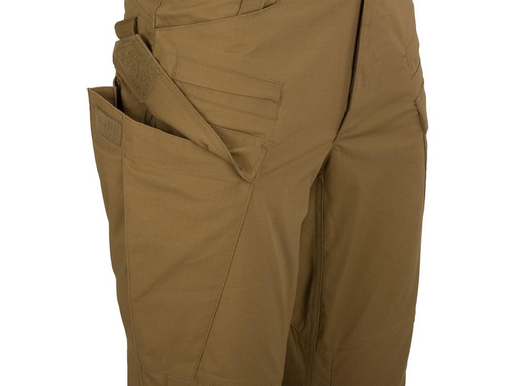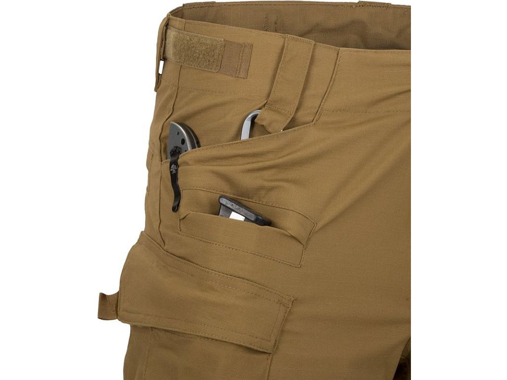 Ty jsou opatřeny zesíleným okrajem, který Vám umožní do kapes zavěsit např. nože a také malým očkem sloužícím pro karabiny. Pod kapsami na ruce je menší plochá kapsa, která je určena pro mobilní telefony, popřípadě pistolové zásobníky. Pod malou plochou kapsou se nacházejí cargo kapsy uzavírané pomocí knoflíků kanadského typu.