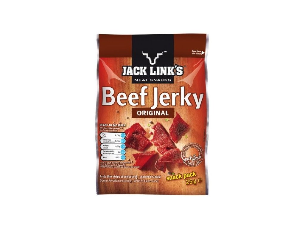 Sušené maso - jerky podle tradičního receptu rodiny Jacka Linka z roku 1890. Tradiční chuť, která si získala mnoho příznivců po celém světě. Klasická chuť "original" Vás nikdy nepřestane bavit. Na výrobu Jack Link´s Jerky se používá výhradně libové maso, proto jerky obsahuje méně než 4% tuku. Jerky je mimořádně bohaté na bílkoviny, které tvoří přibližně 50% z celkové hmotnosti.