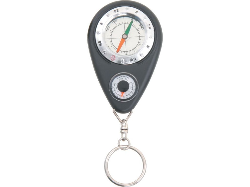 Kompas s teploměrem a s přívěskem na klíče. Kompas je zasazený do černého plastového obalu. Teploměr měří ve stupních Fahrenheita i Celsia.
