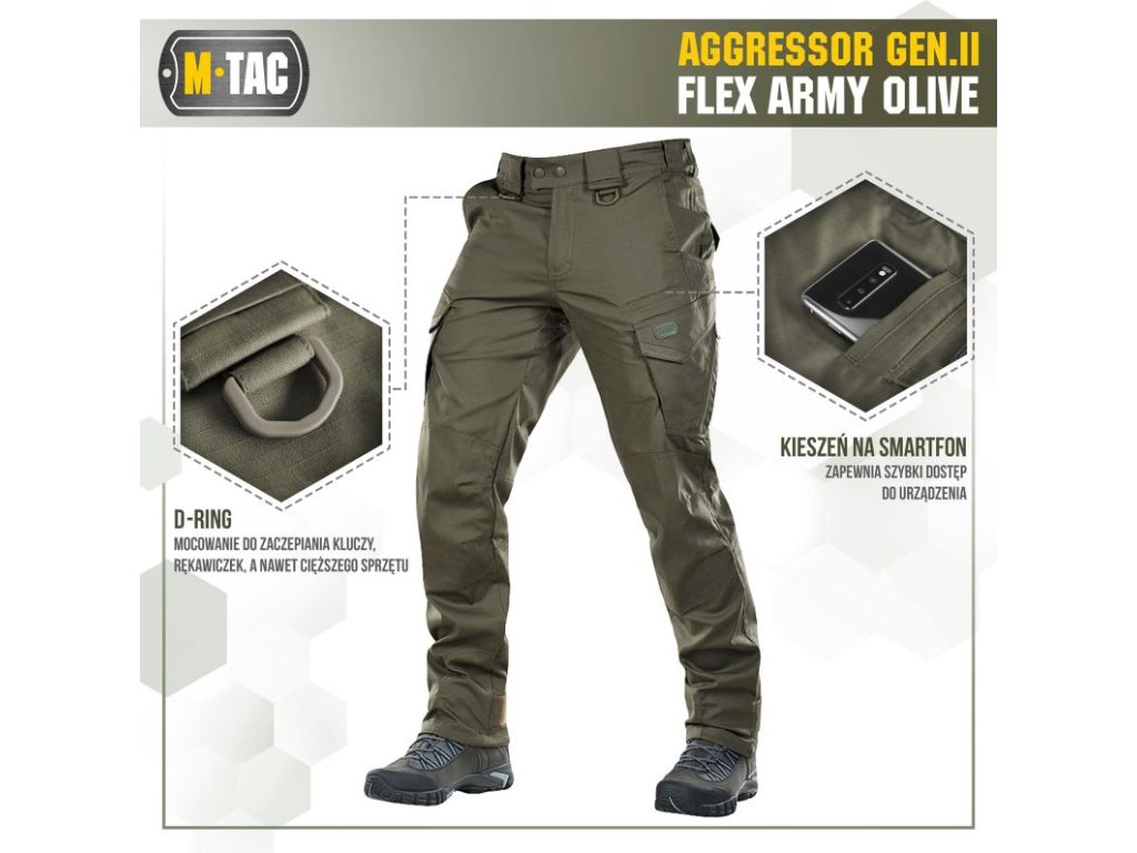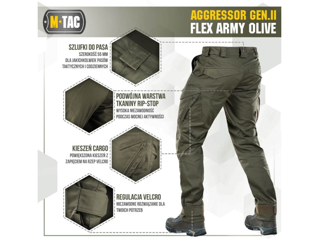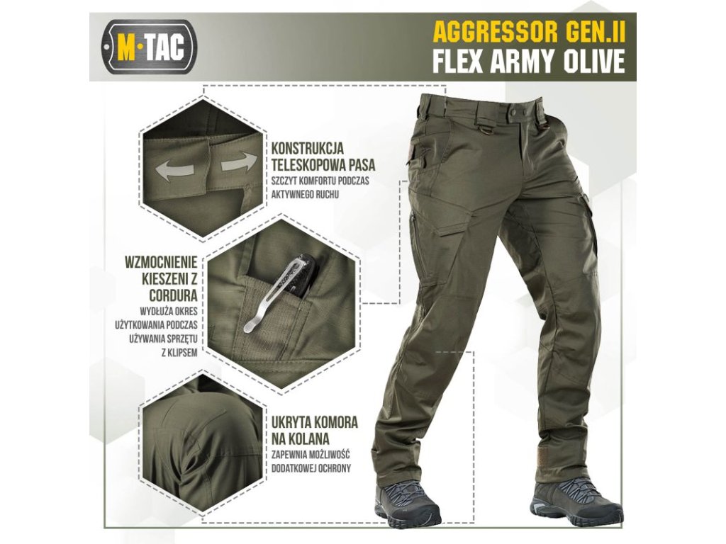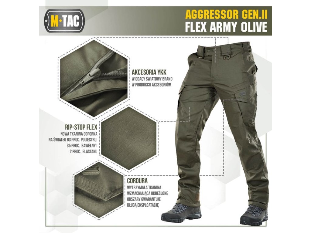 Taktické kalhoty Aggressor Gen.II Flex se výborně hodí na trénink, cvičení na střelnici, do práce, ale i na služební cestu či procházku. Značka M-TAC se snaží přinášet na trh technologické novinky. Kalhoty ušité z lehké jednobarevné rip-stop látky, s teflonovou úpravou na ochranu před vodou a blátem. Látka s obsahem polyesteru a bavlny je příjemná na tělo, dobře drží barvu a vyznačuje se vysokou odolností.