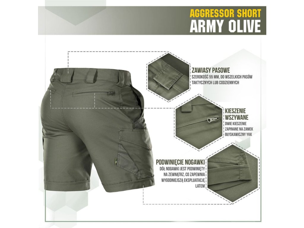 Šortky M-Tac Aggressor Lite vycházejí z první generace kalhot Aggressor, ale mají také nějaké doplňky. Jde o zkrácený model cargo kalhot: po kolena, s všitou chlopní. Takové šortky se vám budou hodit jak ve městě, tak i v přírodě, zejména v horkém počasí. Dají se nosit na tréninku, na střelnici, do práce, ale i na cestování či procházku. Šortky neomezují v pohybu a zároveň působí jako decentní každodenní oblečení. Diskrétní, ale funkční design umožňuje použít šortky jako prvek taktického oblečení.