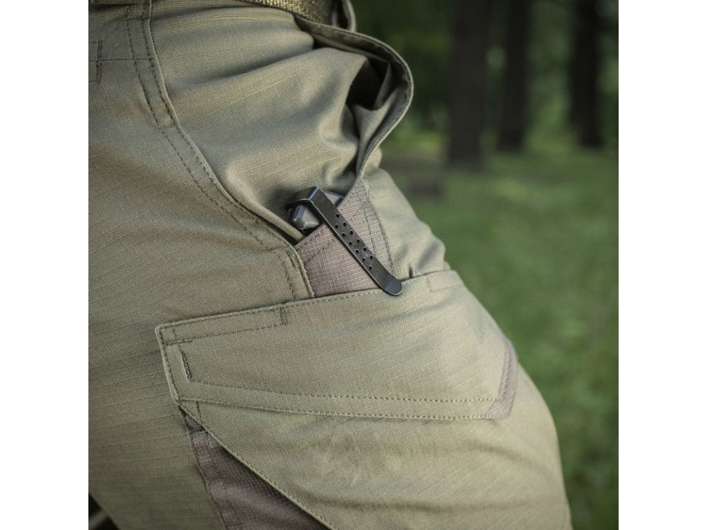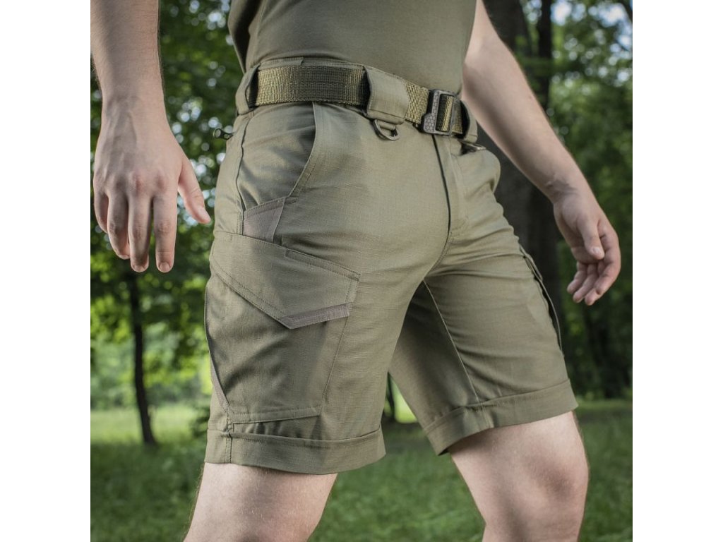Pohodlí pohybu zajišťuje nejen elastický polobavlněný flex rip-stop materiál, ale i tunelová konstrukce popruhu, která perfektně sedí v pase a nepřekáží při ohýbání. Pas se zapíná na zip, háček a knoflík, velikost je možné regulovat vnitřními elastickými vsadkami. Přímo pod předními poutky jsou všité YKK D-kroužky na připevnění předmětů pomocí karabinky nebo poutka. Šortky jsou určeny k nošení s opaskem do šířky 5,5 cm. Šest praktických kapes vám umožní optimálně uspořádat věci, které s sebou každý den nosíte. Široké boční kapsy kalhot jsou ve spodní části vyztuženy vložkami: je zde místo na připevnění klipu na skládací nůž, taktického pera nebo mini baterky. Boční cargo kapsy jsou vybaveny asymetrickou chlopní na suchý zip, což usnadňuje vklouznutí ruky do kapsy, ale nedovolí vysypat obsah ani při aktivním pohybu. Rozšíření cargo kapes je dekorativním a funkčním prvkem. Umožňuje v případě potřeby zvětšit vnitřní objem kapes pro přenášení velkých předmětů.