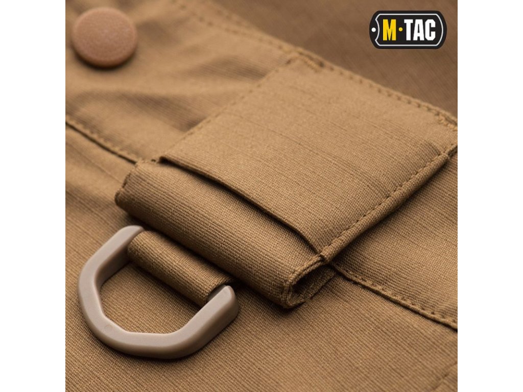 Pohodlí pohybu zajišťuje nejen elastický polobavlněný flex rip-stop materiál, ale i tunelová konstrukce popruhu, která perfektně sedí v pase a nepřekáží při ohýbání. Pás se zapíná na zip, háček a knoflík, velikost je možné regulovat vnitřními elastickými vsadkami. Přímo pod předními poutky jsou všité YKK D-kroužky na připevnění předmětů pomocí karabinky nebo smyčky. Šortky jsou určeny k nošení s páskem do šířky 5,5 cm. Šest praktických kapes vám umožní optimálně uspořádat věci, které s sebou každý den nosíte. Široké boční kapsy kalhot jsou ve spodní části vyztuženy vložkami: je zde místo na připevnění klipu na skládací nůž, taktického pera nebo mini baterky. Boční cargo kapsy jsou vybaveny asymetrickou chlopní na suchý zip, což usnadňuje vklouznutí ruky do kapsy, ale nedovolí vysypat obsah ani při aktivním pohybu. Rozšíření cargo kapes je dekorativním a funkčním prvkem. Umožňuje v případě potřeby zvětšit vnitřní objem kapes pro přenášení velkých předmětů.