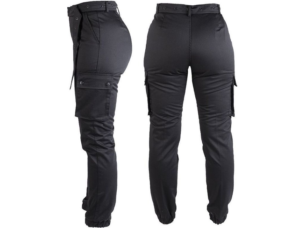 Stylové dámské armádní kalhoty s vysokým pasem. Na uložení výbavy na kalhotách najdete celkem čtyři kapsy. Dvě klasické na ruce se šikmým vstupem a dvě stehenní cargo kapsy kryté klopou s cvočky. Kalhoty jsou zakončeny elastickou lemovkou. Ke kalhotám je dodáván pásek.