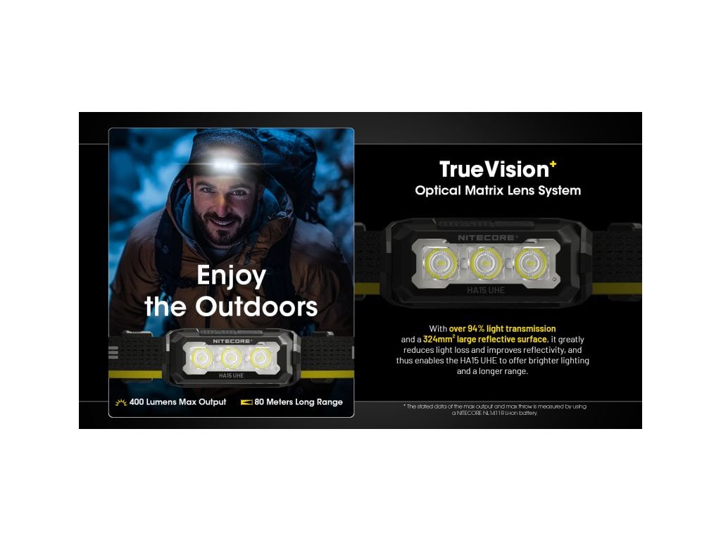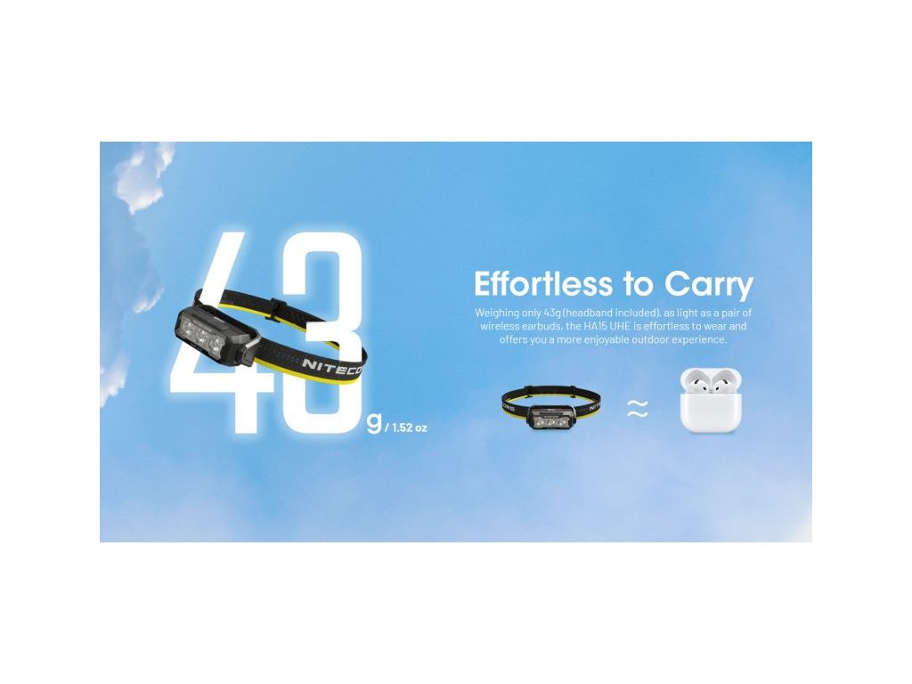 NITECORE HA15 UHE je víceúčelová ultralehká čelovka s výkonem 400 lumenů a dosvitem až 80 metrů, navržená pro každodenní použití, turistiku, běh, kemping či práci v exteriéru. Váží jen 43 g, takže ji téměř necítíte na hlavě.