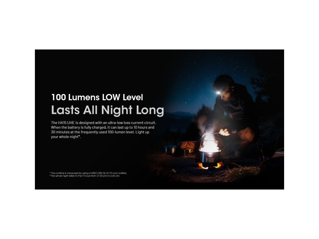 Čelovka využívá vysoceúčinné UHE LED s bílým i červeným světlem a nabízí maximální výdrž až 114 hodin. Díky široké kompatibilitě je možné ji napájet 1× AA baterií (alkalickou, Ni-MH, lithiovou) nebo nabíjecím Li-ion akumulátorem NL1411R 14500 (1 100 mAh), který je součástí balení.