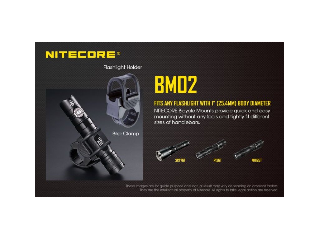 Držák NITECORE BM02 umožňuje rychlou a pevnou montáž svítilen NITECORE (a jiných s průměrem těla 25,4 mm / 1") na řídítka kola. Ideální pro cyklisty, kteří chtějí využít své taktické nebo outdoorové svítilny i během jízdy.