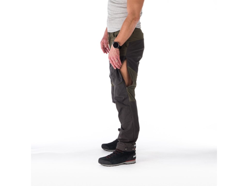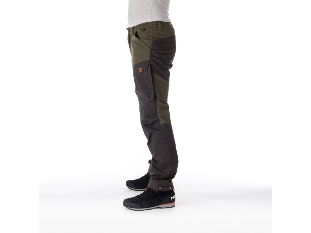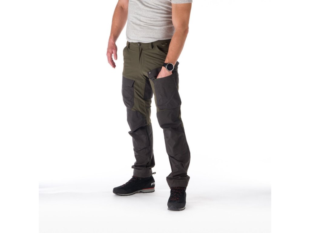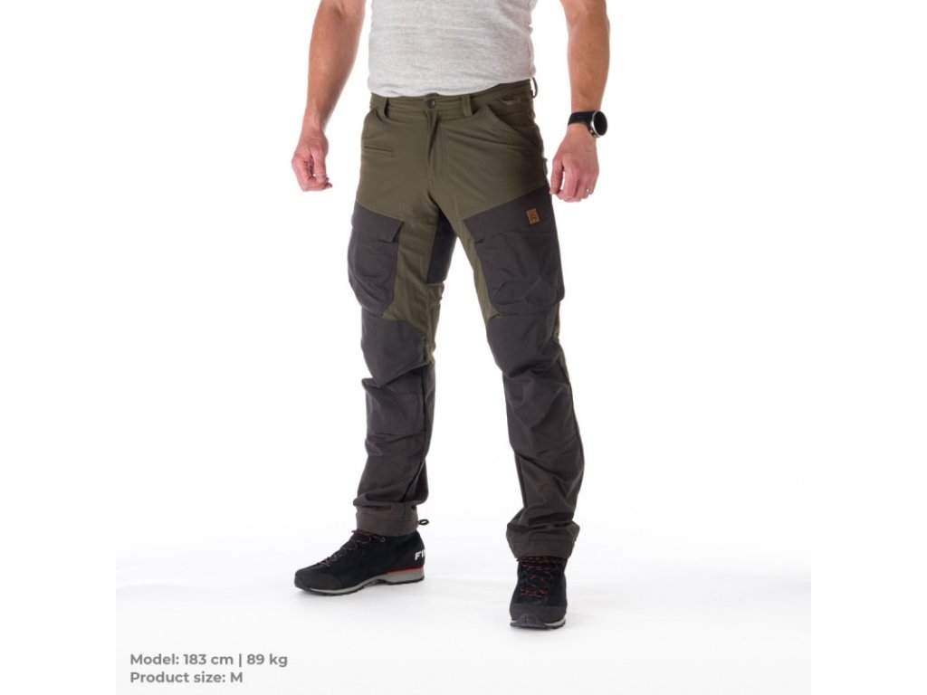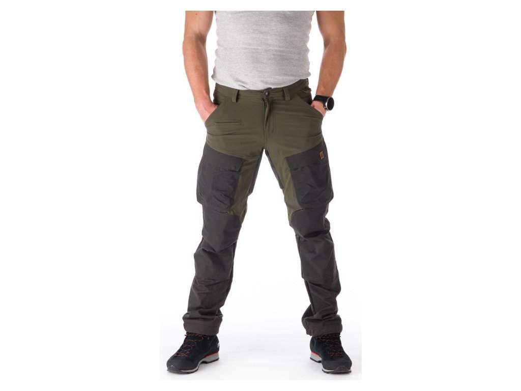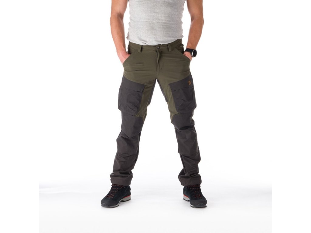 Kalhoty složené ze dvou materiálů. Z přední části od kapes dolů a v zadní sedací části je hrubší odolnější materiál, zbytek kalhot je ze strečového příjemného materiálu, který se dobře přizpůsobí vaší pohybové aktivitě. Na boku je přidána speciální kapsa, do které si můžeš uložit sekeru nebo větší nůž. Kalhoty ideální na procházky lesem...Ověřený střih s krokovým klínem je zárukou praktického komfortu. Větrání je zajištěno na boční vnější části kalhot bez síťoviny. Propracované kapsy na stehnech uschovají mapu, doklady, či KPZ-ku.