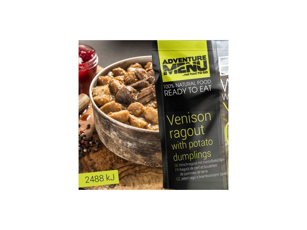 Ingredients: potato fries ( 28% - potatoes, wheat flour, wheat semolina, egg, salt ), venison ( 20% ), root vegetables ( carrot, celery, parsley ), red wine, sunflower oil, bacon, tomato paste ( tomatoes, salt, sugar ), wheat flour, lemon, currant marmalade ( currants, sugar, pectin ), sugar, salt, wild spices.