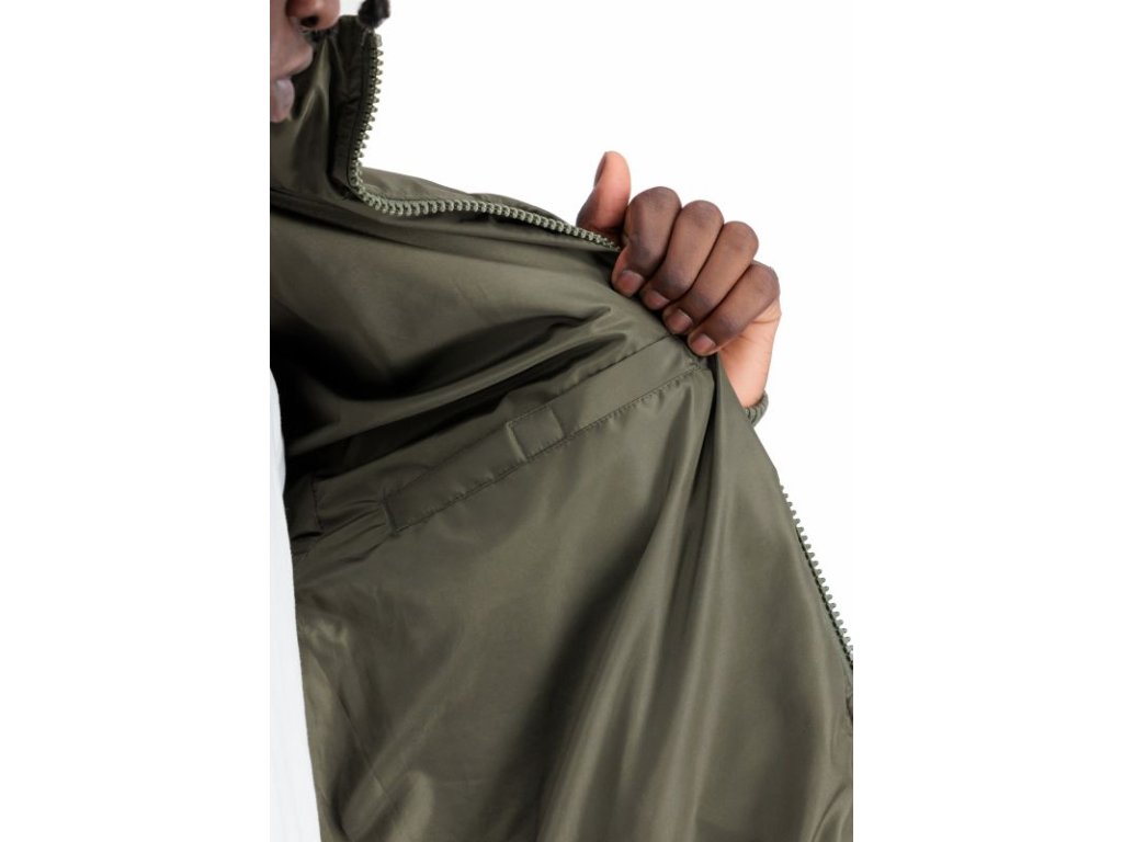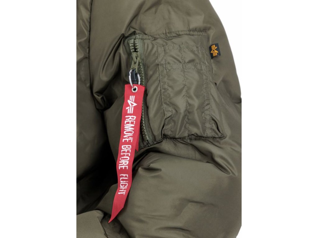 This model has been carefully sewn, and the manufacturer paid attention to even the smallest details. On the left sleeve, you will find the RBF tape, which refers to the tradition of flight jackets that Alpha Industries has been producing for the US Air Force for many years. The inscription “Remove Before Flight” is another characteristic feature.