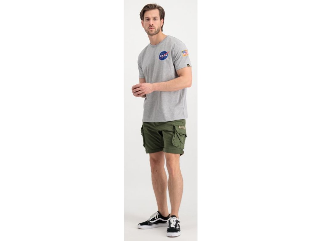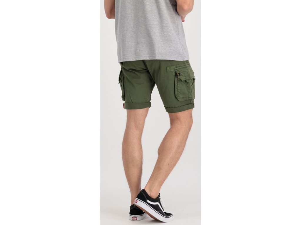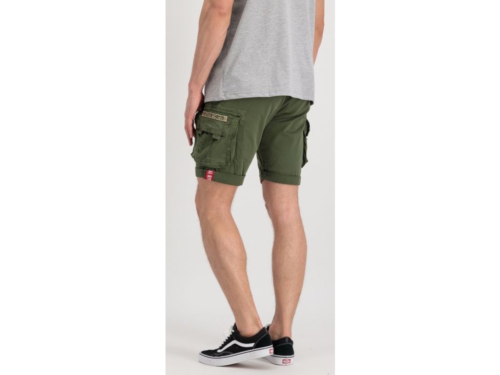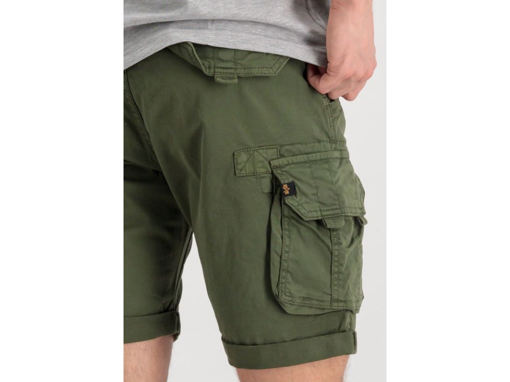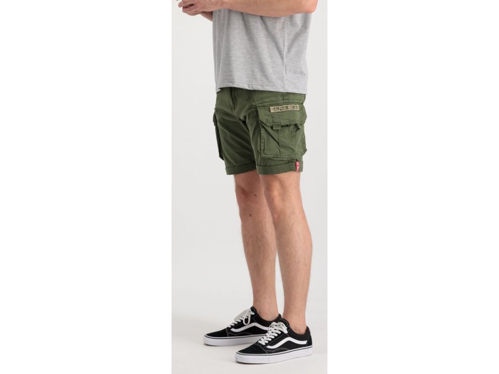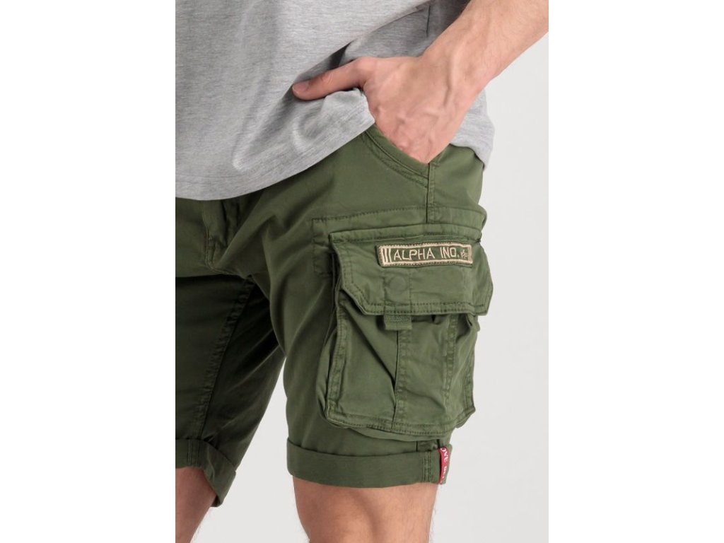 The design includes many practical pockets - two cargo pockets with snaps, two front slanted pockets, and two back pockets with snaps. On the left pocket, there is an embroidered Alpha Industries inscription, and other details like the logo on the bottom hem of the left leg and a flag label on the right pocket give the shorts a unique appearance.