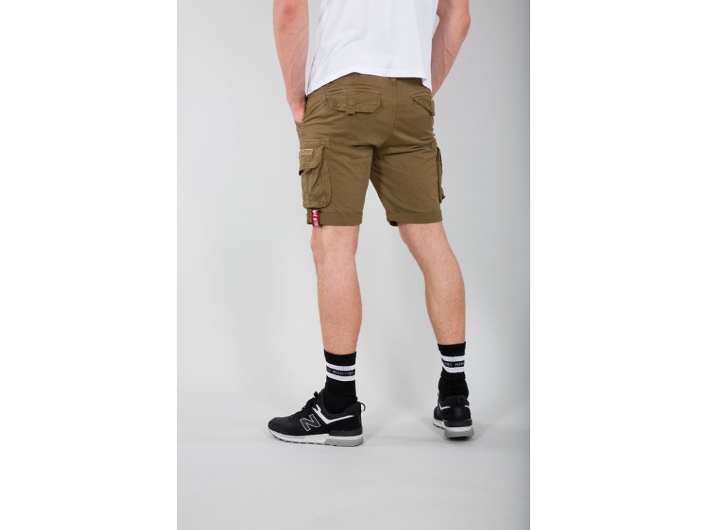 The design includes many practical pockets - two cargo pockets with snaps, two front slanted pockets, and two back pockets with snaps. On the left pocket, there is an embroidered Alpha Industries inscription, and other details like the logo on the bottom hem of the left leg and a flag label on the right pocket give the shorts a unique appearance.