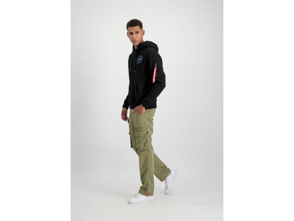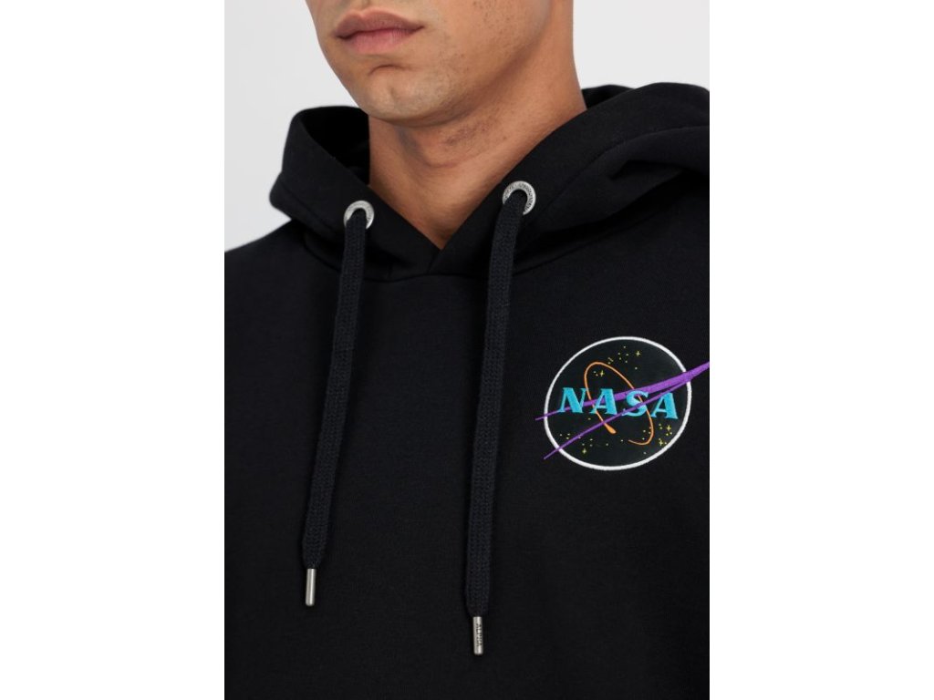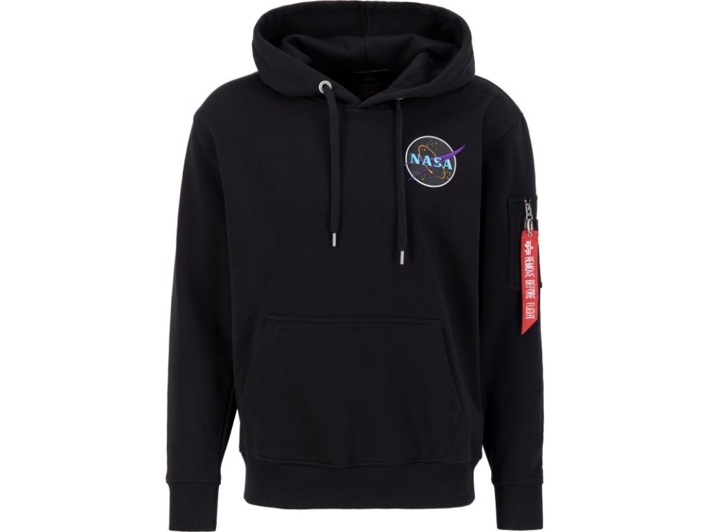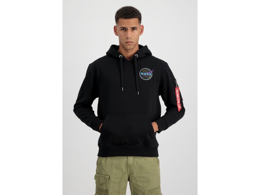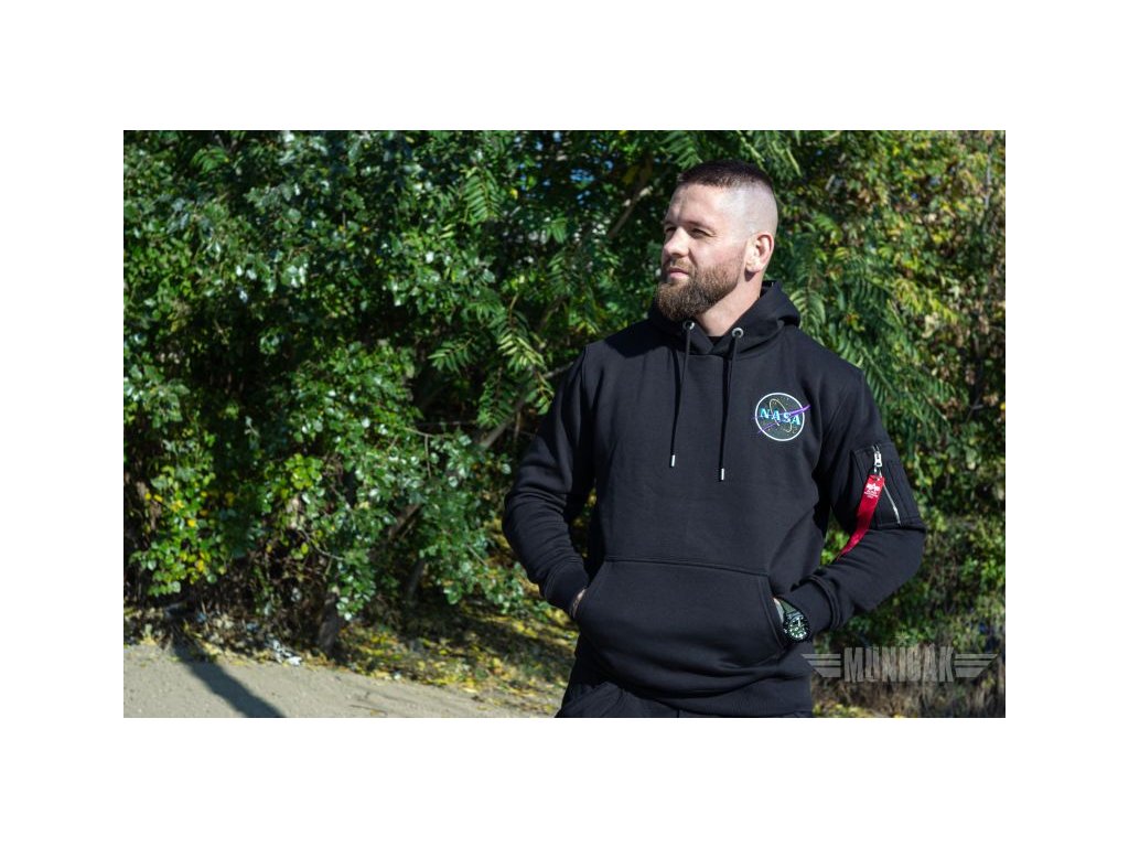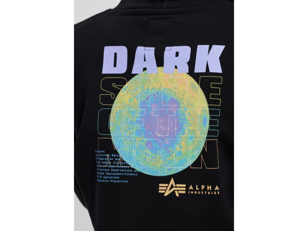 ALPHA INDUSTRIES Sweatshirt Dark Side is a stylish and comfortable piece from a limited collection inspired by the dark side of the universe and collaboration with NASA. This black sweatshirt with reflective elements and a large Dark Side of the Moon print on the back is designed to stand out with its design while providing practicality for everyday wear.