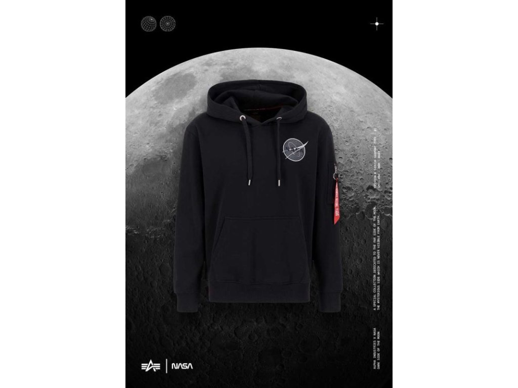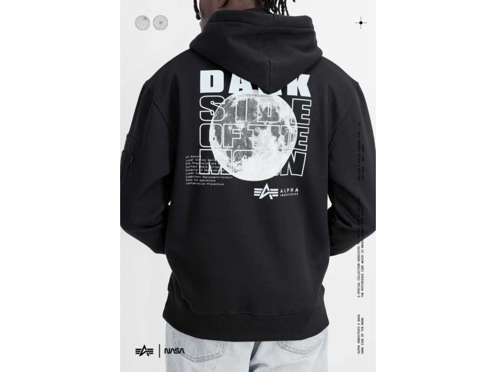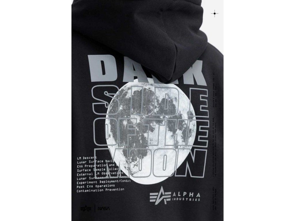 ALPHA INDUSTRIES Sweatshirt Dark Side is a stylish and comfortable piece from a limited collection inspired by the dark side of the universe and collaboration with NASA. This black sweatshirt with reflective elements and a large Dark Side of the Moon print on the back is designed to stand out with its design while providing practicality for everyday wear.