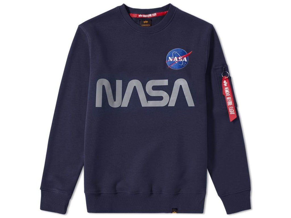 Black sweatshirt with reflective NASA print from Alpha Industries, with NASA patch and sleeve pocket and iconic tag “remove before flight”.