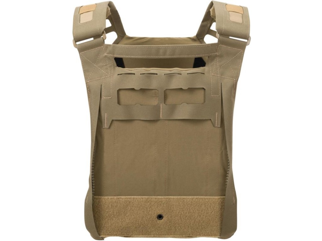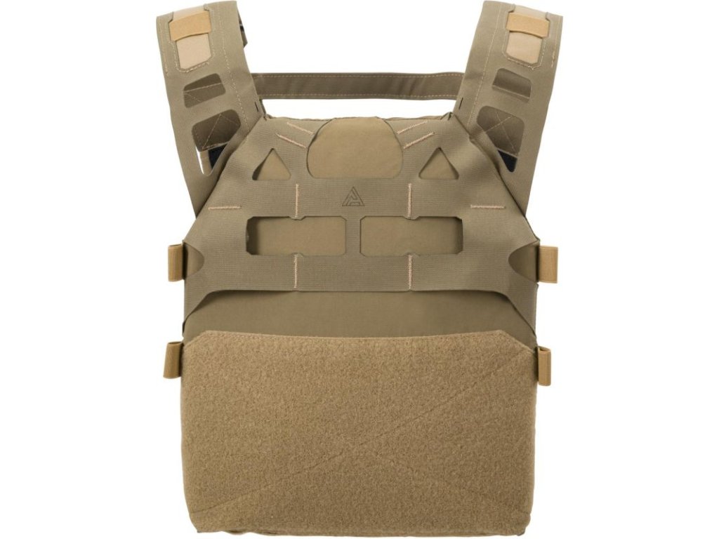 Plate carrier vest compatible with ballistic inserts. The vest is entirely made of durable yet lightweight softshell nylon, and the limited amount of laminate used has reduced its weight to a minimum. The flexible construction of the ballistic plate pocket allows the use of most popular standards, including SAPI and Swimmer Cut.