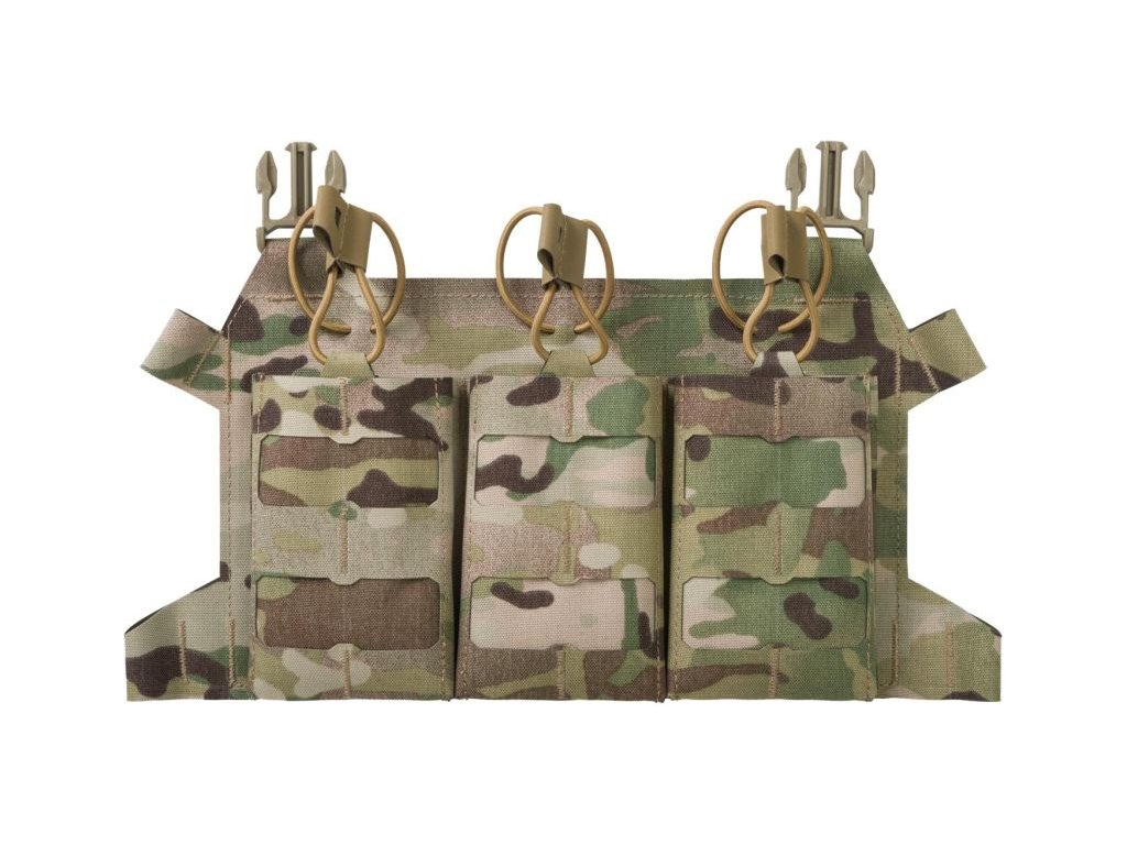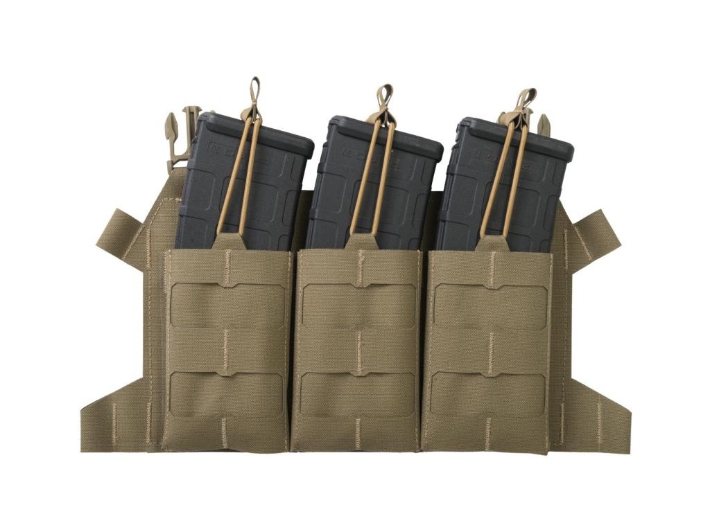 Front panel with three pouches for magazines from Direct Action made of Cordura 500D laminate, designed for use with BEARCAT® and SPITFIRE® series vests. The purpose of the panel is to carry up to three magazines for M4/AR15. Thanks to the skeletal construction, it is one of the lightest in its category and ensures minimalism. Bungee cords are responsible for securing the magazines from the top.