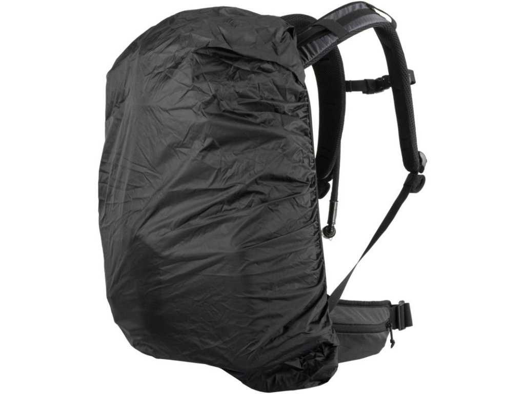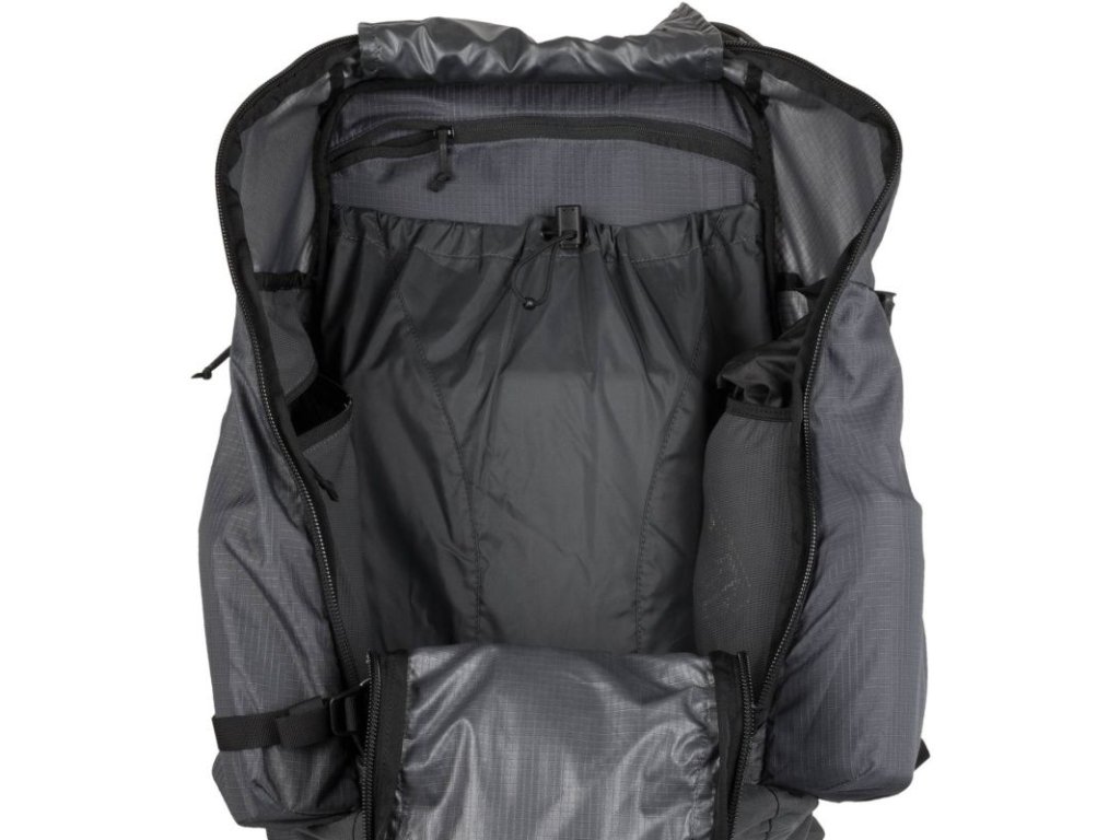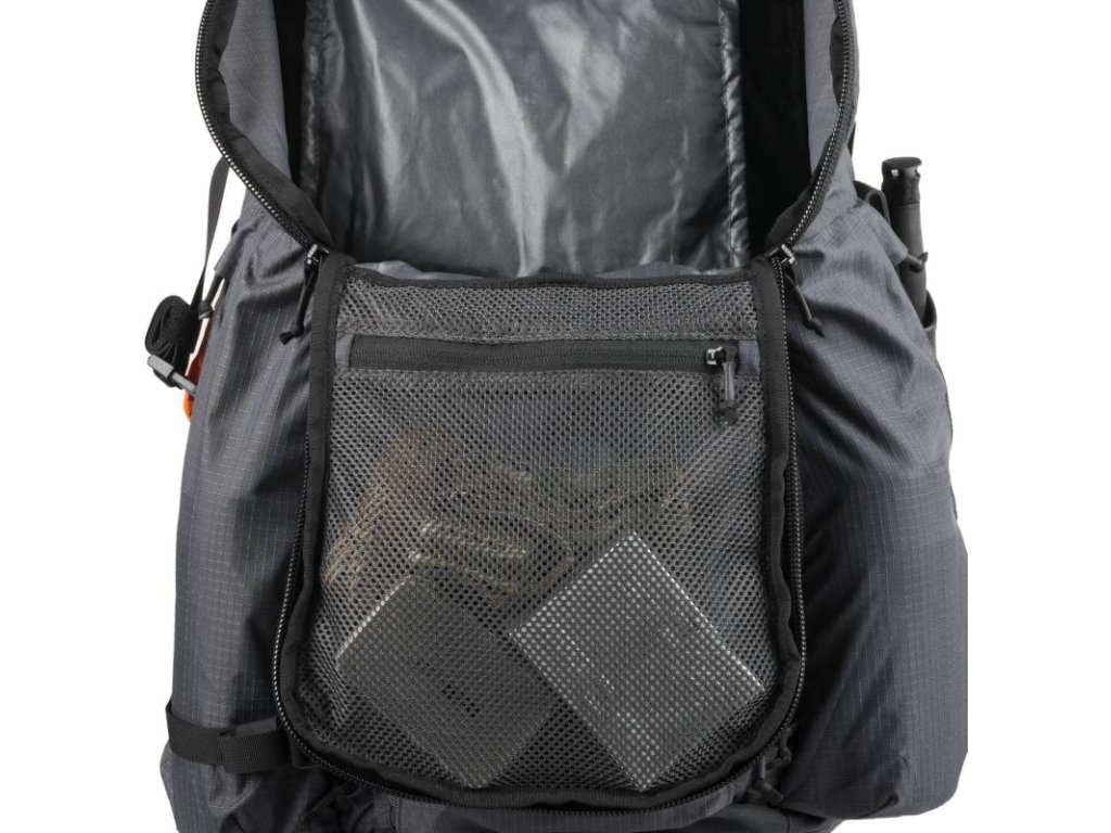 This lid features a mesh pocket with top access and a zipper closure. Furthermore, the backpack has two internal mesh pockets on its sides. On both sides of the backpack, there are pockets with vertical zippers. Zippered pockets are also on the bases of the hip belt. The back of the backpack is padded for comfort, reinforced, and covered with mesh for good ventilation. Two anatomically shaped shoulder straps with elastic loops, a chest strap with a quick-release buckle, and a hip belt with a quick-release buckle ensure comfortable carrying and even weight distribution of the load. The reinforced bottom hides a pocket for a rain cover, which is part of the backpack.