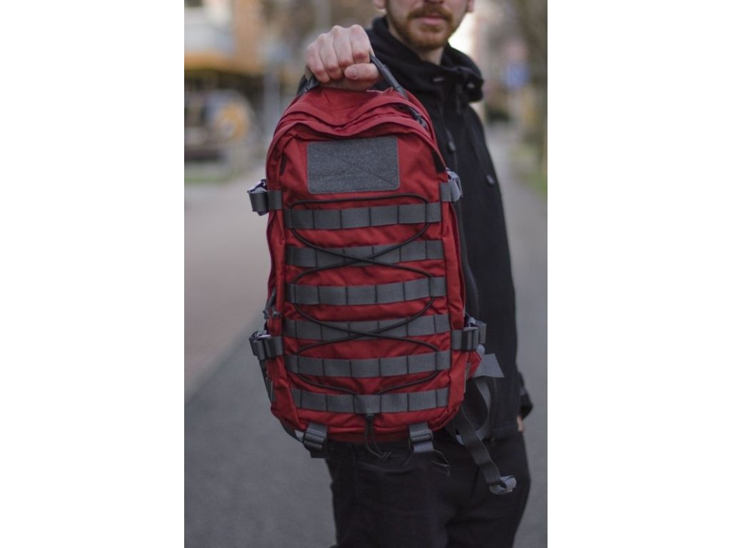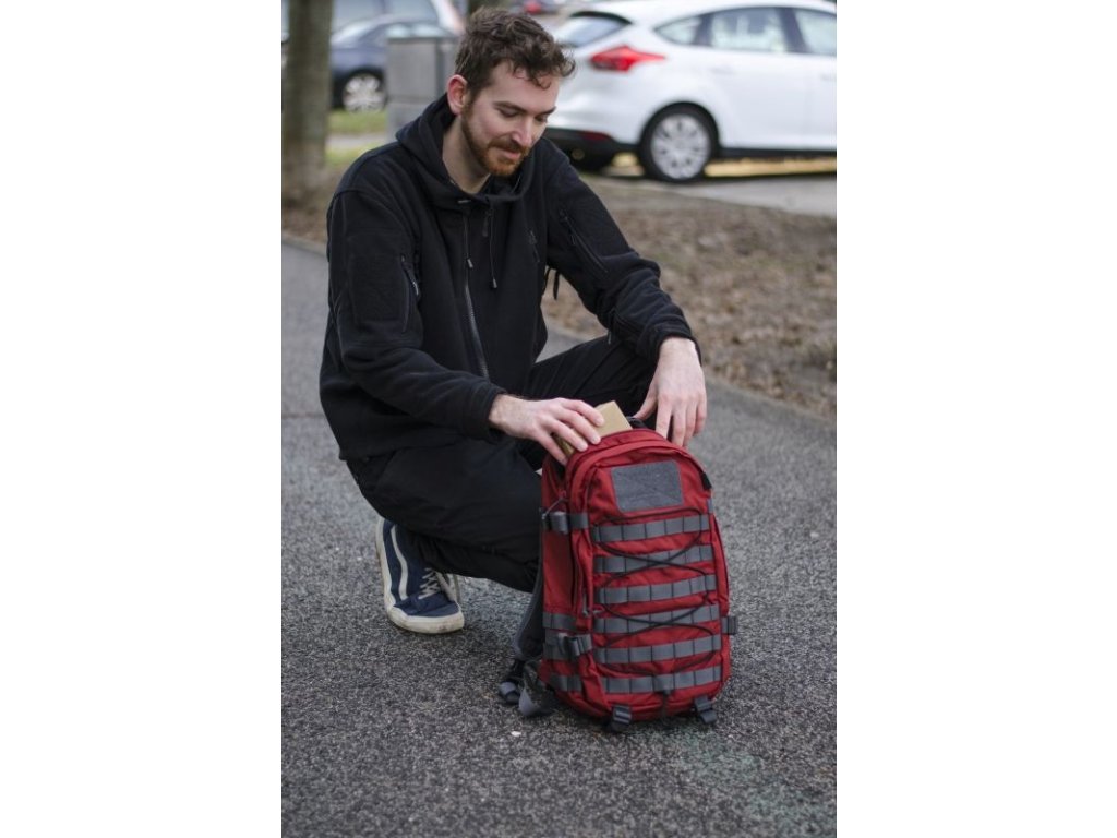 Inside the main compartment, there is a mesh pocket. On the outside of the backpack, there are adjustable mesh straps and a MOLLE / PALS system. The front part of the backpack features a VELCRO panel. On the sides of the backpack, there are adjustable straps, allowing for the reduction of the backpack's dimensions or the attachment of additional gear. The backpack is equipped with high-quality YKK zippers. On the back, there is a mesh ventilation system.
