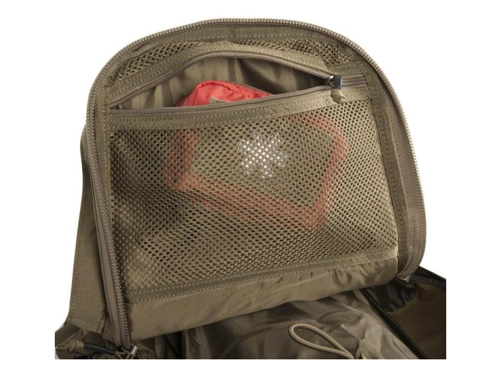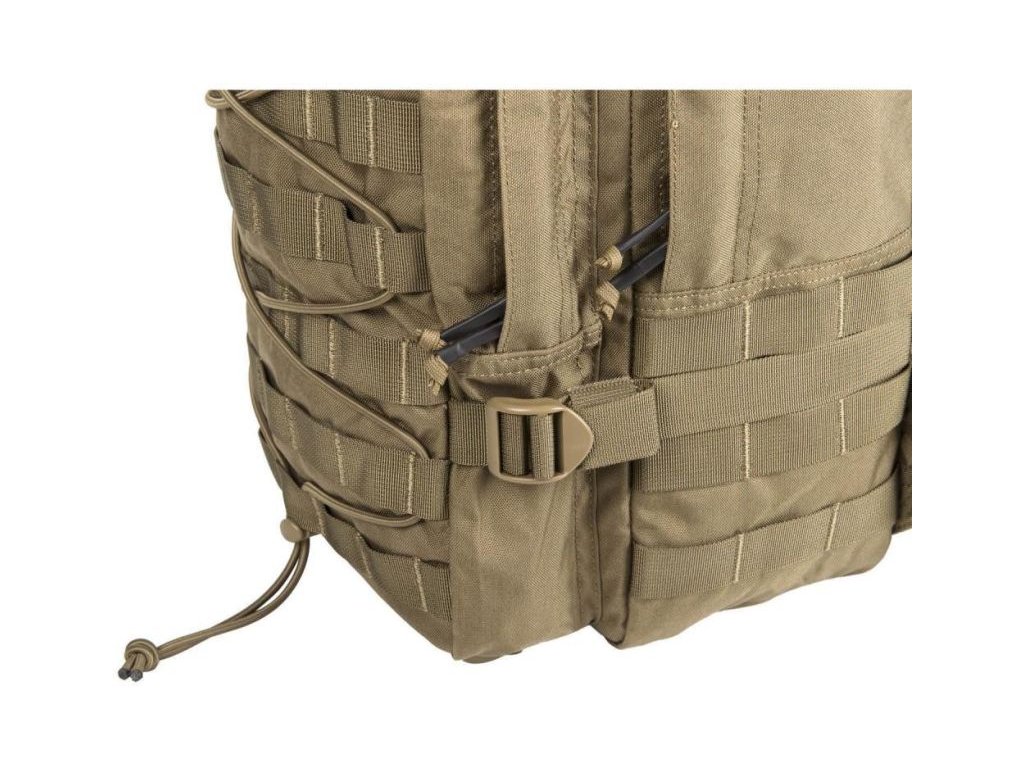 Inside the main compartment, there is a mesh pocket. On the outside of the backpack, there are adjustable mesh straps and a MOLLE / PALS system. The front part of the backpack features a VELCRO panel. On the sides of the backpack, there are adjustable straps, allowing for the reduction of the backpack's dimensions or the attachment of additional gear. The backpack is equipped with quality YKK zippers. On the back, there is a mesh ventilation system.