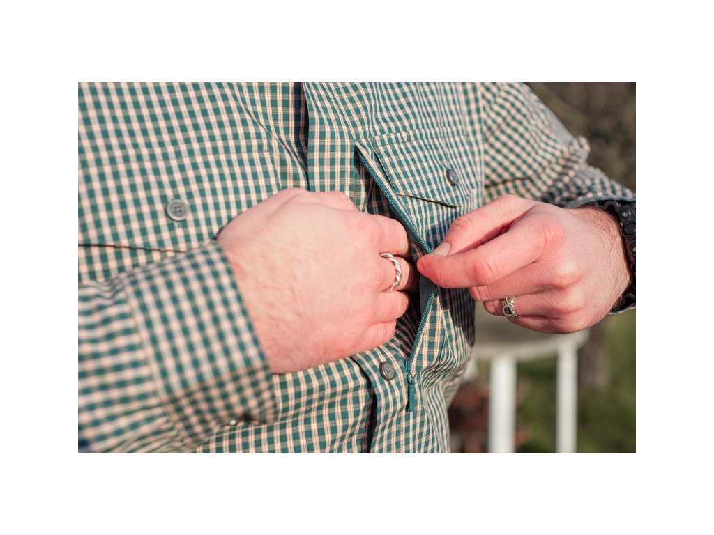 » Hidden vertical left side chest pocket with YKK zipper closure