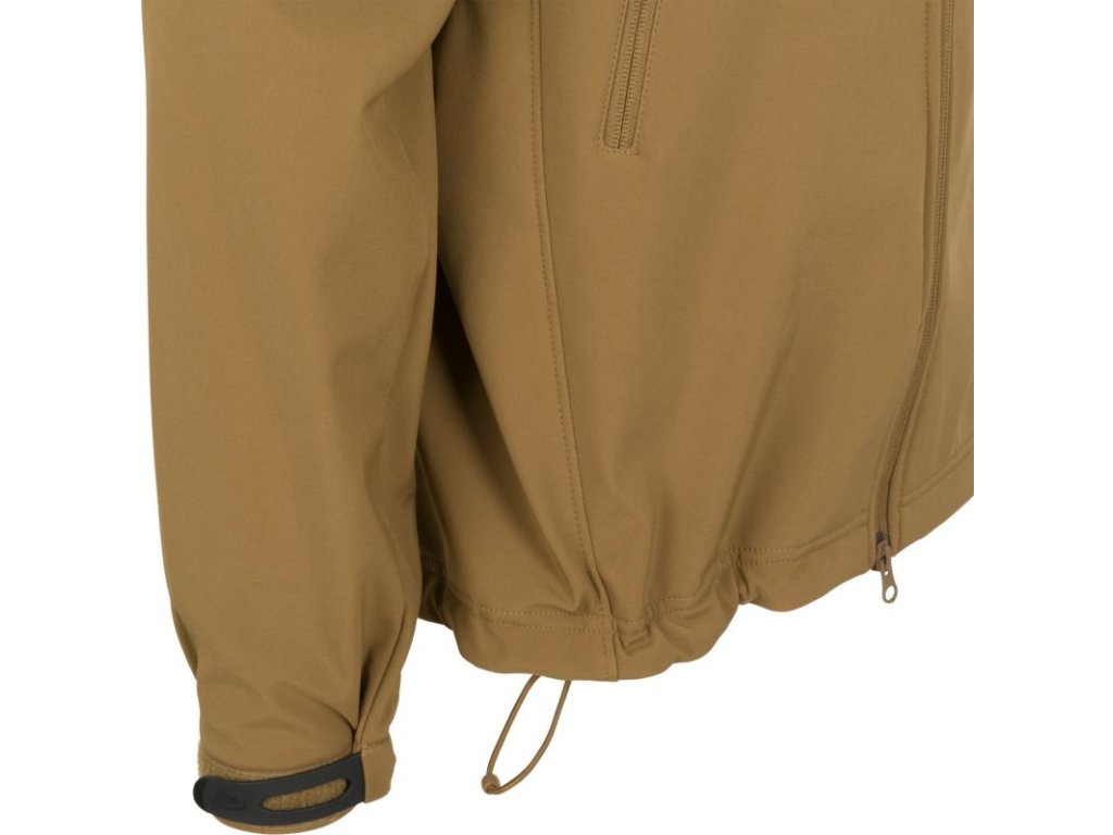 The Gunfighter jacket is equipped with one internal pocket with a Velcro closure, two arm pockets with zippers and Velcro panels, one pocket on the left arm with a zipper closure, two chest pockets with zipper closures, and a large back pocket with two zippers. The chest pockets are equipped with a D-ring for hanging small items and a hole for threading a headphone cable. The Gunfighter softshell jacket is equipped with a sturdy, wind-resistant zipper with two sliders, cuffs adjustable with Velcro, and waist adjustment with an elastic cord and plastic stopper.