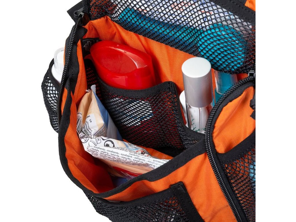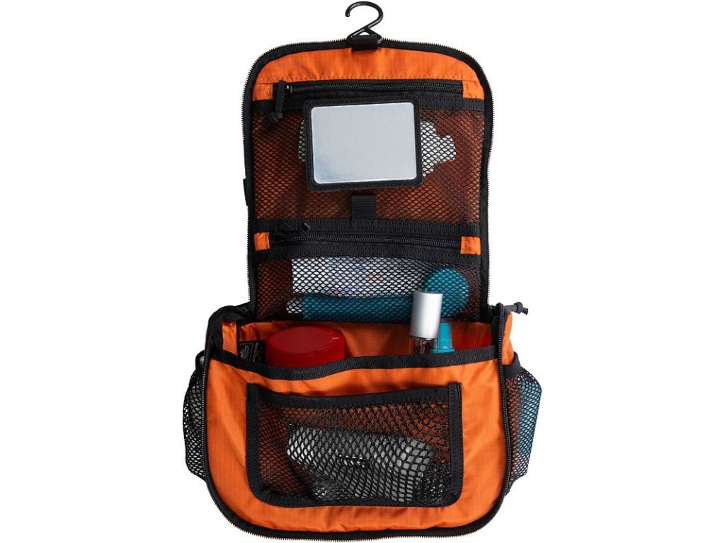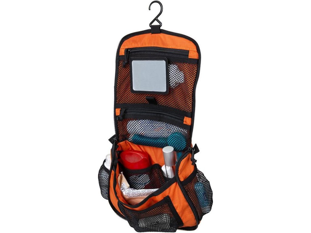 The interior space of the bag is optimized for maximum organization. It includes internal mesh pockets that help separate smaller items. Thanks to the detachable mirror and sturdy hook, it can be easily hung in the bathroom or another suitable place.