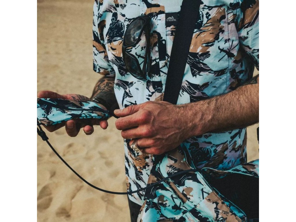 In reality, however, the blue shades of this pattern are inspired by special operations conducted on water. Upon closer inspection, you can see a fast-moving RIB (Rigid Inflatable Boat) full of special forces members among the waves. Elsewhere, divers equipped with rifles emerge on the shore, while a helicopter hovers above the water ready to pick them up. These scenes are reminiscent of moments from action films or documentaries about Navy SEAL units.