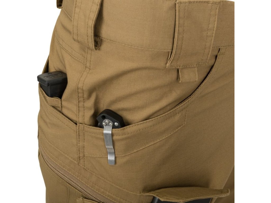 Due to these features, the shorts are destined for all physically demanding activities. The shorts have several useful pockets. These are located on the front, back, and both thighs. Two front pockets have reinforced edges to prevent wear, for example, from folding knife clips. The shorts also have two rear internal symmetrical pockets, which have two small pockets sewn inside. They are intended for safe, comfortable, and discreet carrying of items such as a telescopic baton or spare magazine.