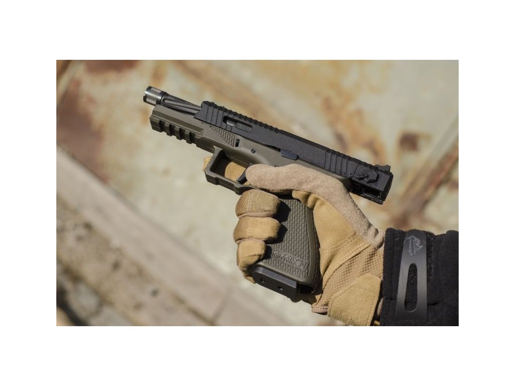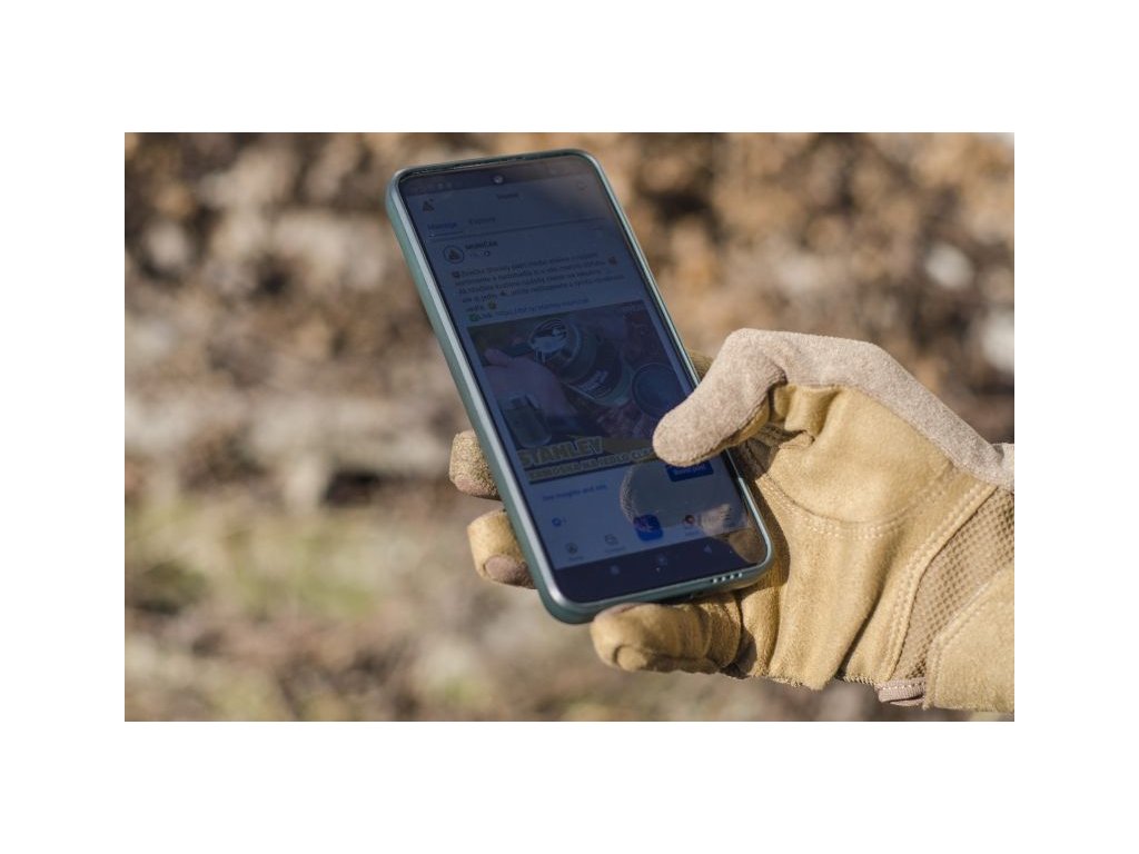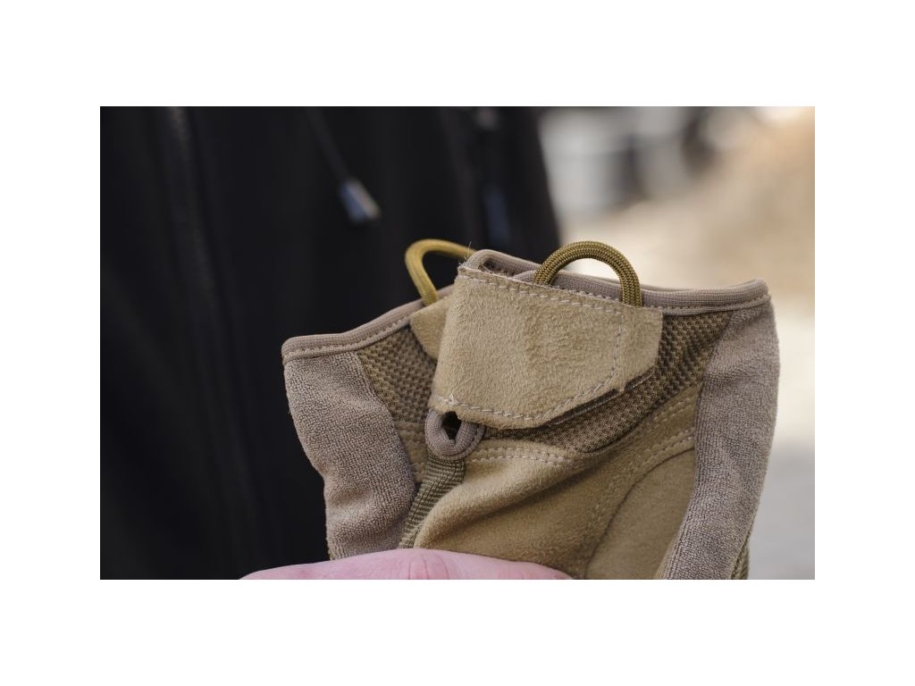 The cuff fastens with a hook and loop closure with a paracord loop. Under the thumb, there is a microfiber patch that can be used to clean shooting glasses or wipe sweat from the forehead. On the tips of the middle finger and thumb, there is an additional patch usable with a touchscreen. Specially designed grooves on the knuckles provide comfort during long-term weapon use.