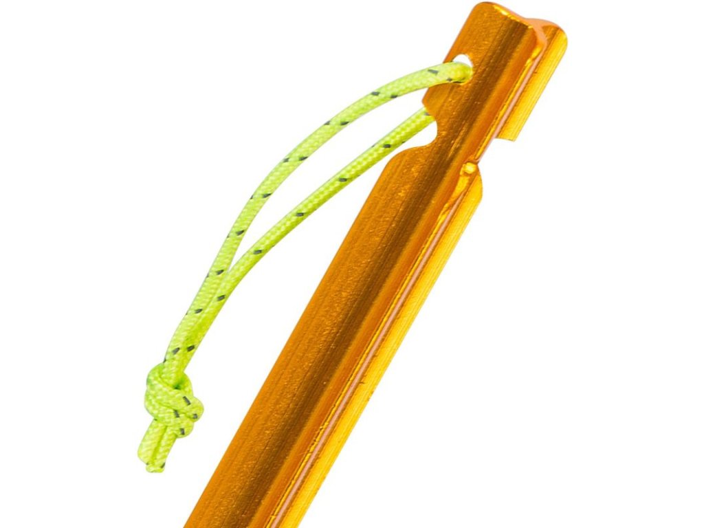 Tent pegs are a set of four lightweight aluminum tent pegs. Thanks to the material they are made of, they are 100% corrosion-resistant. The special profile increases their durability and enhances stability when driving into the ground. Each peg weighs only 12 grams and has a bright cord for easy removal from the ground. The cords also allow the pegs to be connected to each other, so you avoid losing them during the trip.